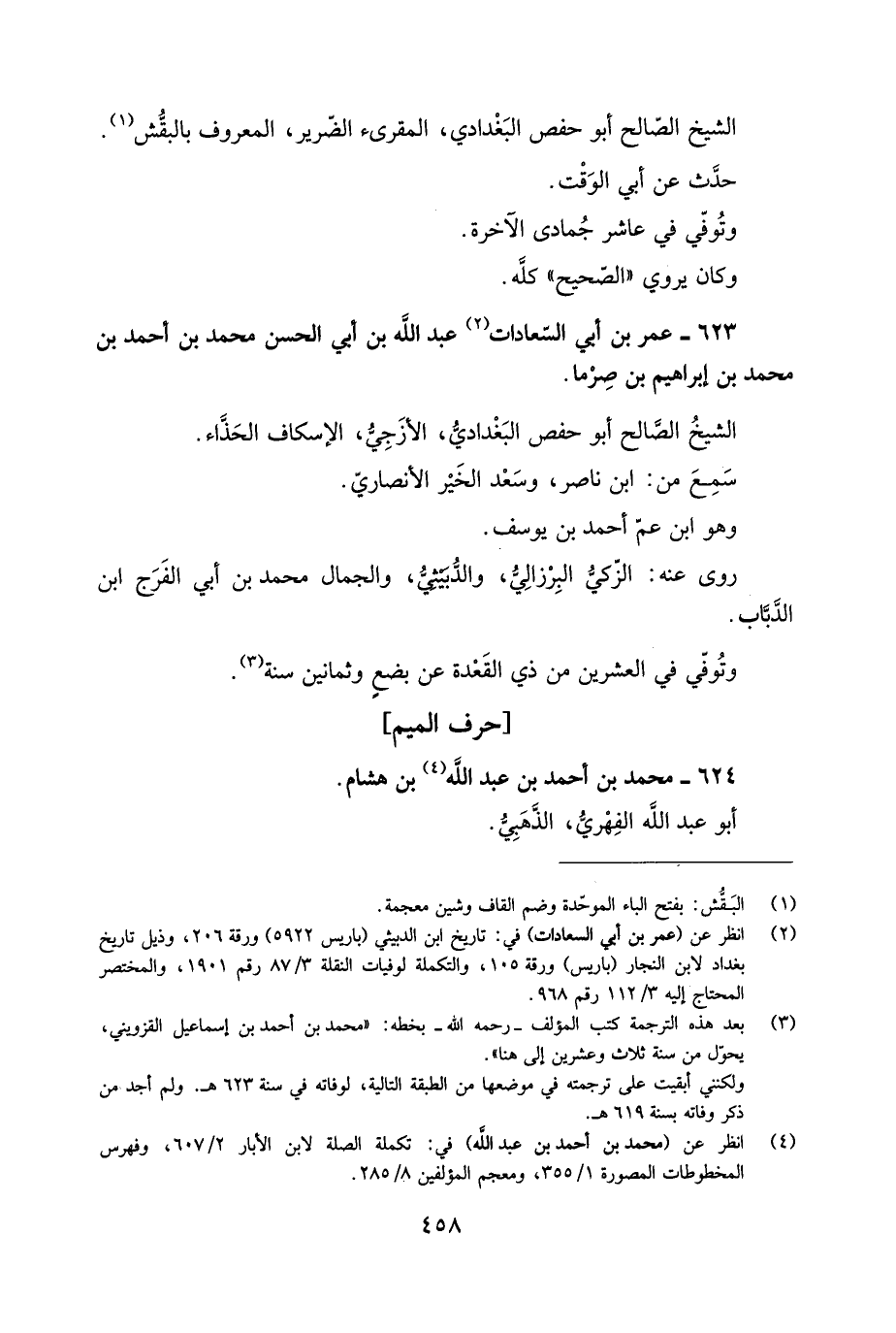 [2] انظر عن (عمر بن أبي السعادات) في: تاريخ ابن الدبيثي (باريس 5922) ورقة 206، وذيل تاريخ بغداد لابن النجار (باريس) ورقة 105، والتكملة لوفيات النقلة 3/ 87 رقم 1901، والمختصر المحتاج إليه 3/ 112 رقم 968.