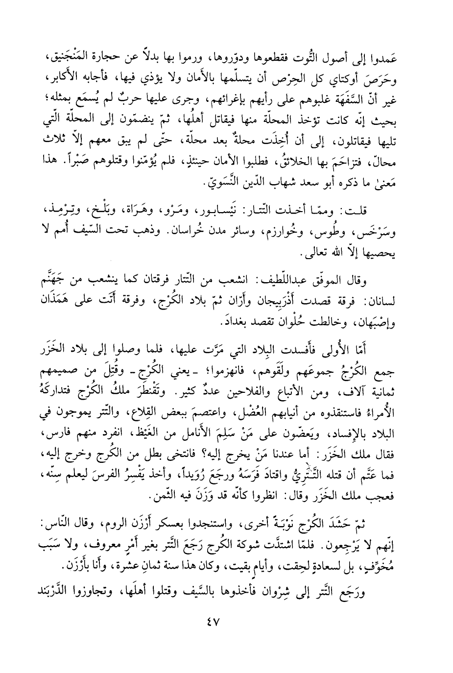 إنّهم لَا يرجعون. فَلَمَّا اشتدّت شوكة الكُرج رجع التَّتر بغير أمرٍ معروف، ولا سبب مُخَوِّفٍ، بل لسعادةٍ لحقت، وأيامٍ بقيت، وَكَانَ هَذَا سنة ثمان عشرة، وَأَنَا بأَرْزَن.