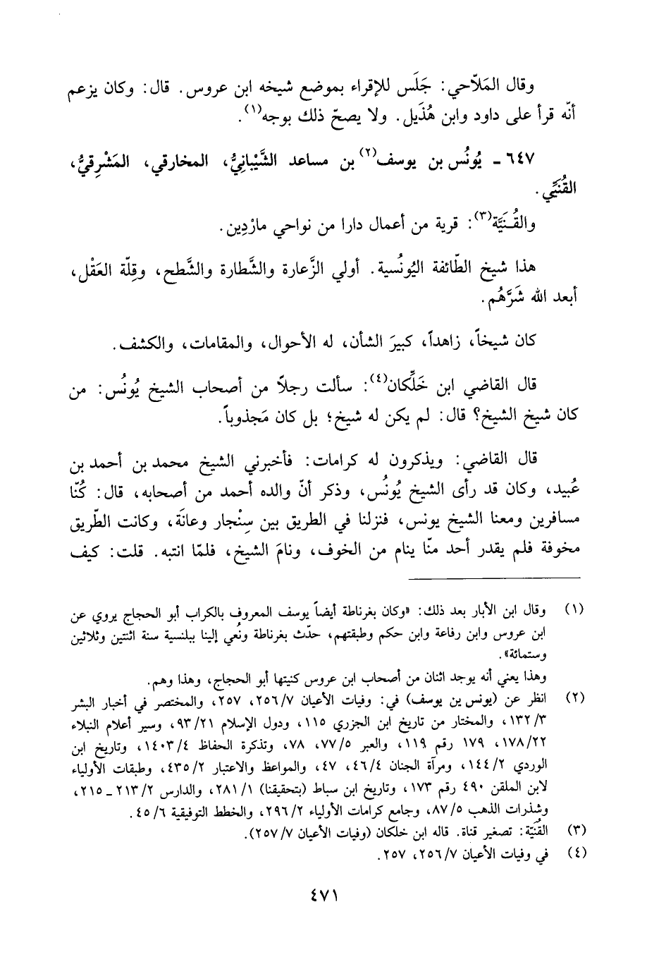 [2] انظر عن (يونس بن يوسف) في: وفيات الأعيان 7/ 256، 257، والمختصر في أخبار البشر 3/ 132، والمختار من تاريخ ابن الجزري 115، ودول الإسلام 21/ 93، وسير أعلام النبلاء 22/ 178، 179 رقم 119، والعبر 5/ 77، 78، وتذكرة الحفاظ 4/ 1403، وتاريخ ابن الوردي 2/ 144، ومرآة الجنان 4/ 46، 47، والمواعظ والاعتبار 2/ 435، وطبقات الأولياء لابن الملقن 490 رقم 173، وتاريخ ابن سباط (بتحقيقنا) 1/ 281، والدارس 2/ 213- 215، وشذرات الذهب 5/ 87، وجامع كرامات الأولياء 2/ 296، والخطط التوفيقية 6/ 45.