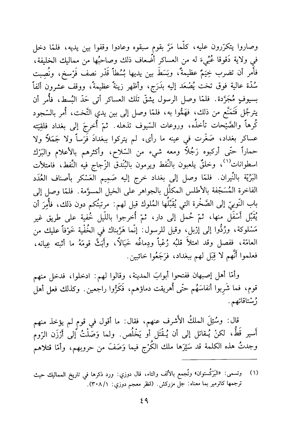 وصاروا يتكرّرون عليه، كلّما مرّ بقوم سبقوه وعادوا وقفوا بين يديه، فَلَمَّا دخل في ولاية دقوقا عُبئ لَهُ من العساكر أضعاف ذَلِكَ وصاحبها من مماليك الخليفة، فأمر أن تضرب خيمٌ عظيمةٌ، وبسط بين يديها بسطا قد نصف فرسخ، ونُصبت سُدَّة عالية فوق تخت يُصعد إِلَيْهِ بدرج، وأظهر زينة عظيمة، ووقف عشرون ألفا بسيوفٍ مجرّدة. فَلَمَّا وصل الرَّسُول يشقّ تِلْكَ العساكر أتى حدّ البُسط، فأُمر أن يترجّل فتمنّع من ذَلِكَ، فهمُّوا بِهِ، فَلَمَّا وصل إلى بين يدي التّخت، أُمر بالسّجود كُرهًا والصَّيْحات تأخذُه، وروعات السّيوف تذهله. ثُمَّ أُخرج إلى بَغْدَاد فلقيته عساكر بَغْدَاد، صغّرت في عينه ما رَأَى، لم يتركوا ببغداد فرسا ولا جملا ولا حمارا حَتَّى أركبوه رجُلًا ومعه شيء من السّلاح، وأكثرهم بالْأعلام والبَرْك أسطوانات [1] ، وخلقٌ يلعبون بالنِّفط ويرمون بالبُنْدق الزّجاج فيه النِّفط، فامتلأت البَرّية بالنِّيران. فَلَمَّا وصل إلى بَغْدَاد خرج إِلَيْهِ صميم العسْكر بأصناف العُدد الفاخرة المُسجّفة بالْأطلس المكلّل بالجواهر عَلَى الخيل المسوَّمة. فَلَمَّا وصل إلى باب النّوبيّ إلى الصّخْرة التي يُقبّلها المُلوك قِيلَ لهم: مرتبتكم دون ذَلِكَ، فأُمر أن يُقبّل أسفل منها، ثُمَّ حُمل إلى دار، ثُمَّ أُخرجوا باللّيل خُفية عَلَى طريق غير مسْلوكة، ورُدُّوا إلى إربل، وَقِيلَ للرسول: إنُما هرَّبناك في الخُفية خوْفًا عليك من العامّة، ففصل وقد امتلأ قلبه رُعبًا ودماغه خبالا، وأبثَّ قومه ما أثبته عيانه، فعلموا أَنَّهُم لَا قبل لهم ببغداد، فرجعوا خائبين.