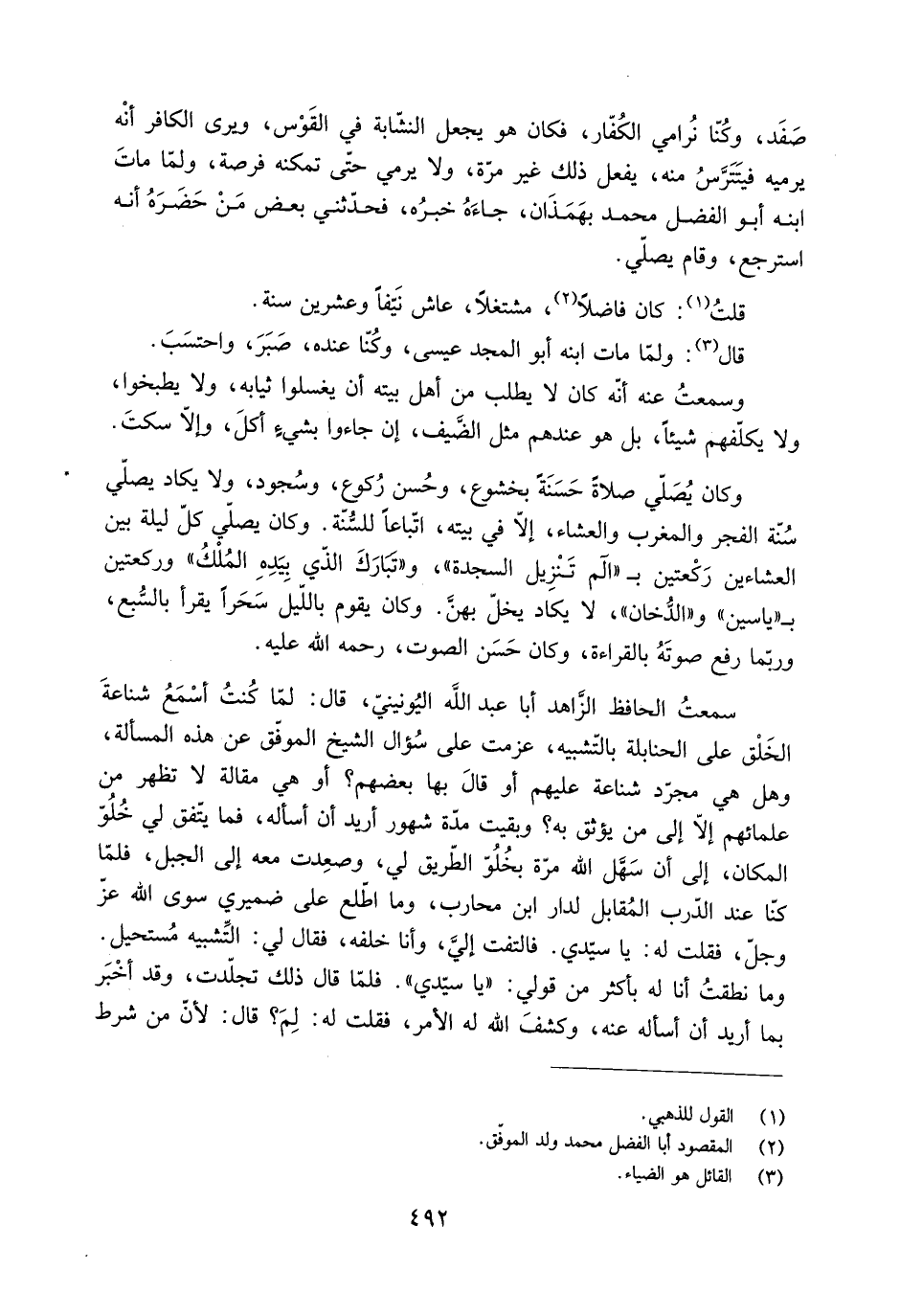 صَفَد، وكُنّا نُرامي الكُفّار، فكان هُوَ يجعل النشّابة في القَوْس، ويرى الكافر أنْه يرميه فيتَتَرَّسُ منه، يفعل ذَلِكَ غير مرَّة، ولا يرمي حتّى تمكنه فرصة، ولمّا ماتَ ابنه أَبُو الفضل مُحَمَّد بهَمَذَان، جاءَهُ خبرُه، فحدّثني بعض مَنْ حَضَرَهُ أَنَّهُ استرجع، وقام يصلّي.