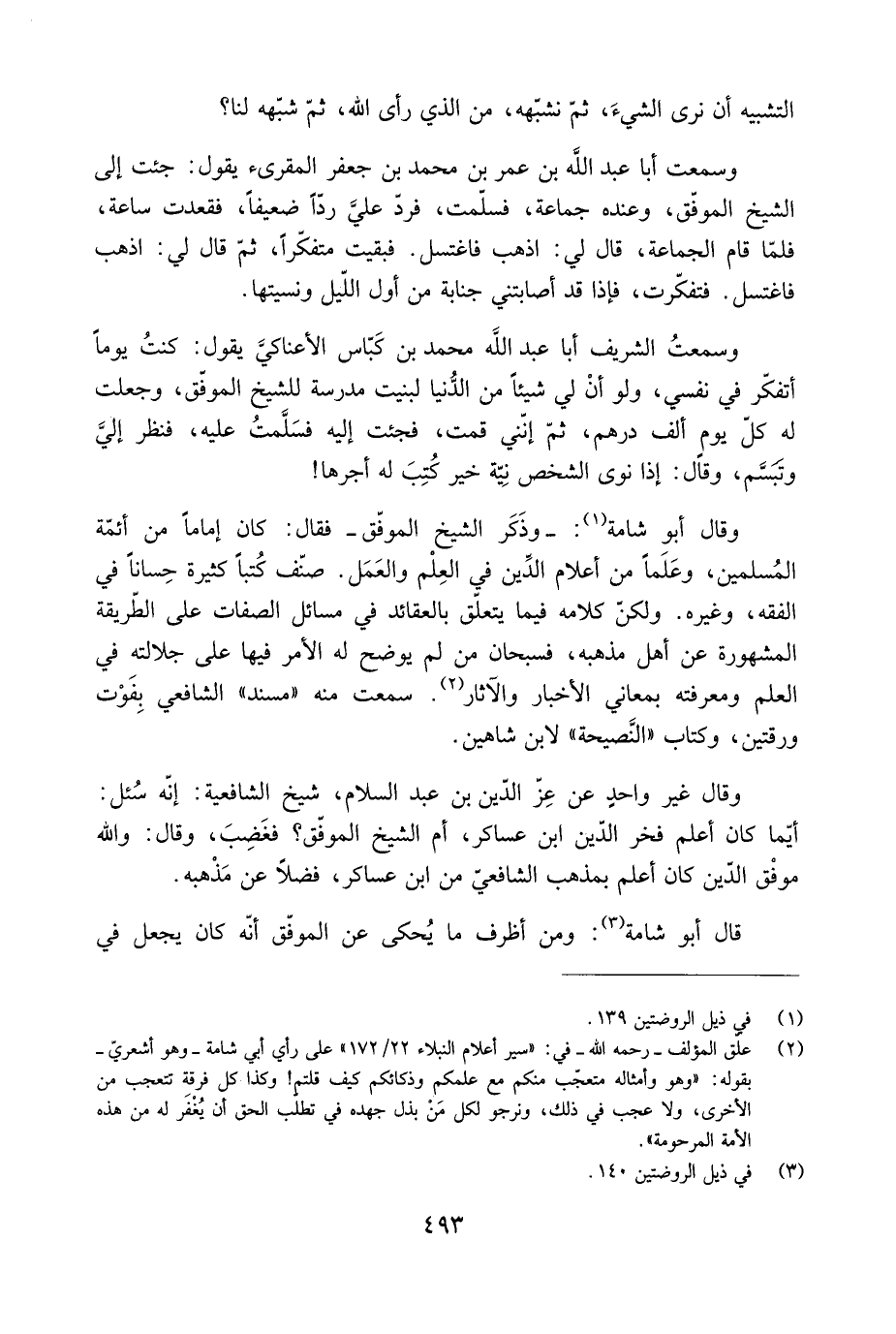 وسمعتُ الشريف أبا عَبْد اللَّه مُحَمَّد بْن كَبّاس الْأعناكيَّ يَقُولُ: كنتُ يوما أتفكّر في نفسي، ولو أنْ لي شيئا من الدُّنيا لبنيت مدرسة للشيخ الموفّق، وجعلت لَهُ كلّ يوم ألف درهم، ثُمَّ إنّني قمت، فجئت إِلَيْهِ فسَلَّمتُ عَلَيْهِ، فنظر إليَّ وتَبَسَّم، وقَالَ: إذَا نوى الشخص نِيَّة خير كُتِبَ لَهُ أجرها! وقال أَبُو شامة [1] : - وذَكَر الشيخ الموفّق- فَقَالَ: كَانَ إماما من أئمَّة المُسلمين، وعَلَمًا من أعلام الدِّين في العِلْم والعَمَل. صنّف كُتبًا كثيرة حسانا في الفقه، وغيره. ولكنّ كلامه فيما يتعلّق بالعقائد في مسائل الصفات عَلَى الطّريقة المشهورة عَنْ أهل مذهبه، فسبحان من لم يوضح لَهُ الْأمر فيها عَلَى جلالته في العلم ومعرفته بمعاني الْأخبار والآثار [2] . سَمِعْتُ منه «مُسْنِد» الشافعيّ بِفَوْت ورقتين، وكتاب «النَّصيحة» لابن شاهين.