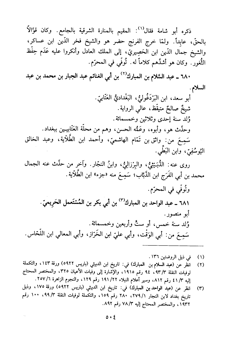 [2] انظر عن (عبد السلام بن المبارك) في: تاريخ ابن الدبيثي (باريس 5922) ورقة 143، والتكملة لوفيات النقلة 3/ 93، 94 رقم 1915، والإشارة إلى وفيات الأعيان 325، والمختصر المحتاج إليه 3/ 41 رقم 812، وسير أعلام النبلاء 22/ 191 رقم 129، والنجوم الزاهرة 6/ 257.