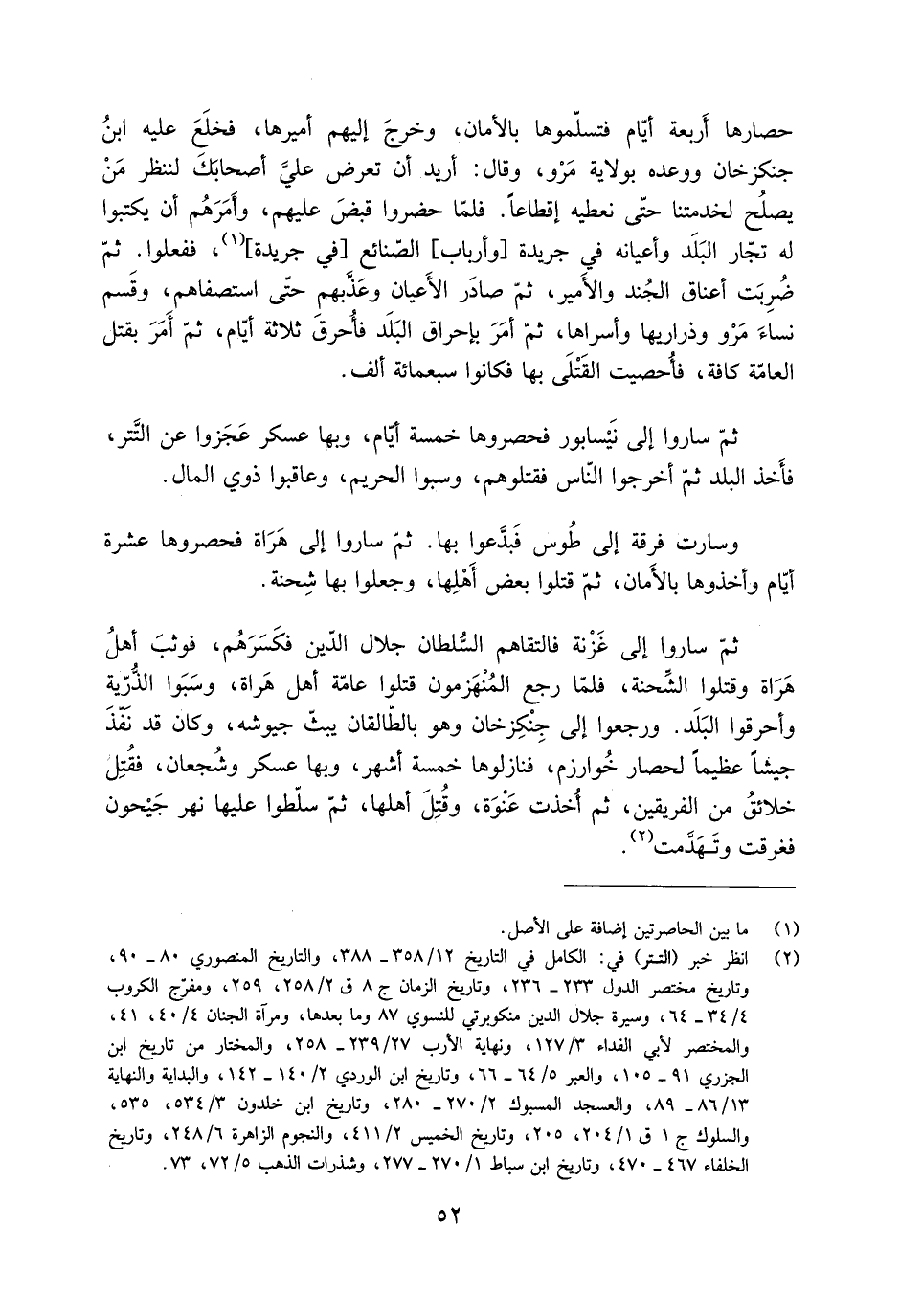 حصارها أربعة أيّام فتسلّموها بالْأمان، وخرجَ إليهم أميرها، فخلع عليه ابن جنكزخان ووعده بولاية مَرْو، وَقَالَ: أريد أن تعرض عَليّ أصحابك لننظر مَنْ يصلح لخدمتنا حَتَّى نعطيه إقطاعا. فَلَمَّا حضروا قبضَ عليهم، وأمرَهُم أن يكتبوا لَهُ تجّار البلد وأعيانه في جريدة [وأرباب] الصّنائع [في جريدة] [1] ، ففعلوا. ثُمَّ ضُربت أعناق الْجُند والْأمير، ثُمَّ صادر الْأعيان وعذَّبهم حَتَّى استصفاهم، وقسم نساء مرو وذراريها وأسراها، ثُمَّ أمر بإحراق البلد فأُحرق ثلاثة أيّام، ثُمَّ أمر بقتل العامّة كافة، فأُحصيت القتلى بها فكانوا سبعمائة ألف.