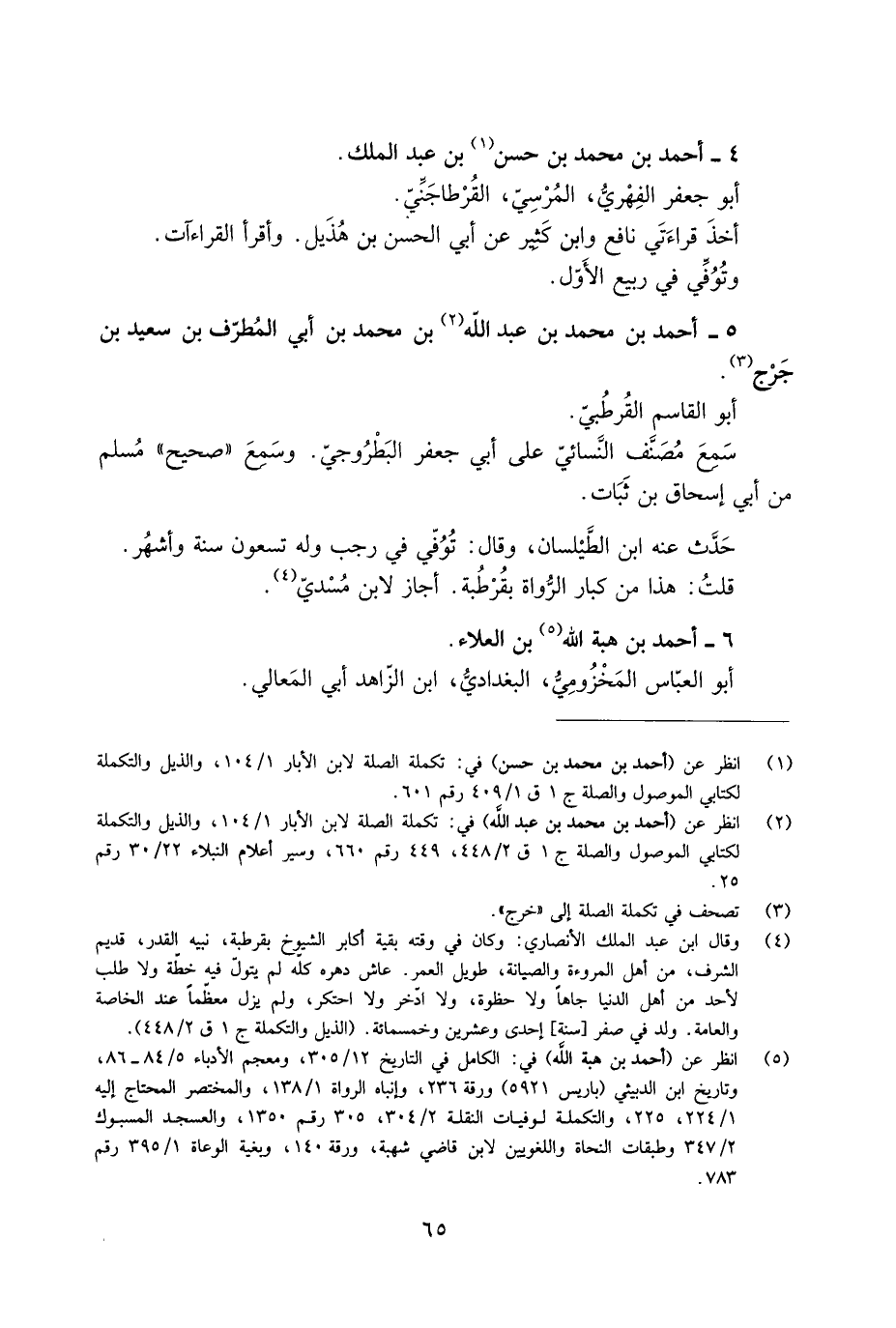 [2] انظر عن (أحمد بن محمد بن عبد الله) في: تكملة الصلة لابن الأبار 1/ 104، والذيل والتكملة لكتابي الموصول والصلة ج 1 ق 2/ 448، 449 رقم 660، وسير أعلام النبلاء 22/ 30 رقم 25.