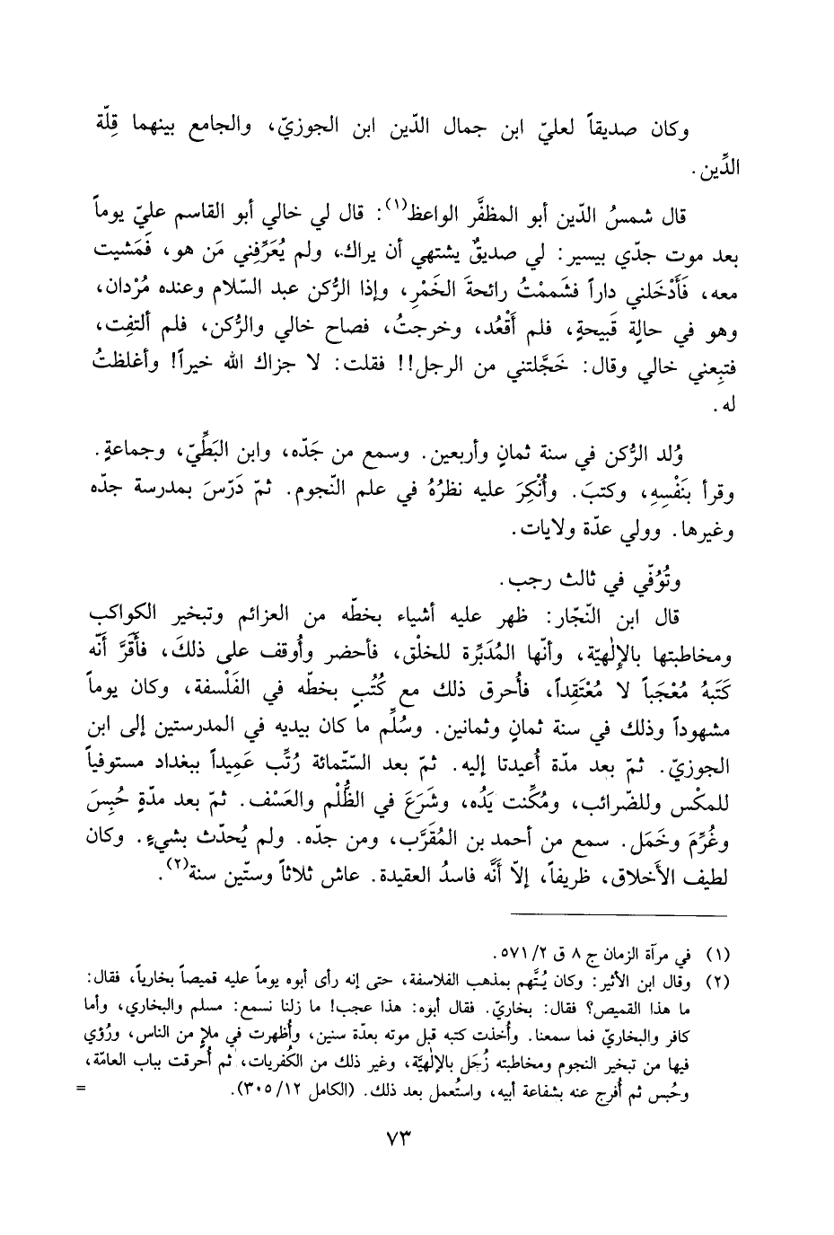 قَالَ ابن النَّجَّار: ظهر عَلَيْهِ أشياء بخطّه من العزائم وتبخير الكواكب ومخاطبتها بالإلهيَّة، وأنّها المُدبّرة للخلْق، فأحضر وأُوقف عَلَى ذلكَ، فأقَرّ أَنَّهُ كتبه مُعْجبًا لَا مُعْتقدًا، فأُحرق ذَلِكَ مَعَ كتبٍ بخطّه في الفَلْسفة، وَكَانَ يوما مشهودا وَذَلِكَ في سنة ثمان وثمانين. وسُلّم ما كَانَ بيديه في المدرستين إلى ابن الْجَوْزيّ. ثُمَّ بعد مدّة أعيدتا إليه. ثمّ بعد السّتّمائة رُتِّب عميدا ببَغْدَاد مستوفيا للمكْس وللضّرائب، ومُكّنت يده، وشرعَ في الظُّلم والعَسْف. ثُمَّ بعد مدَّةٍ حُبس وغُرّم وخمل. سَمِعَ من أَحْمَد بن المُقَرَّب، ومن جَدّه. ولم يُحدّث بشيءٍ. وَكَانَ لطيف الْأخلاق، ظريفا، إلّا أَنَّهُ فاسد العقيدة. عاش ثلاثا وستّين سنة [2] .