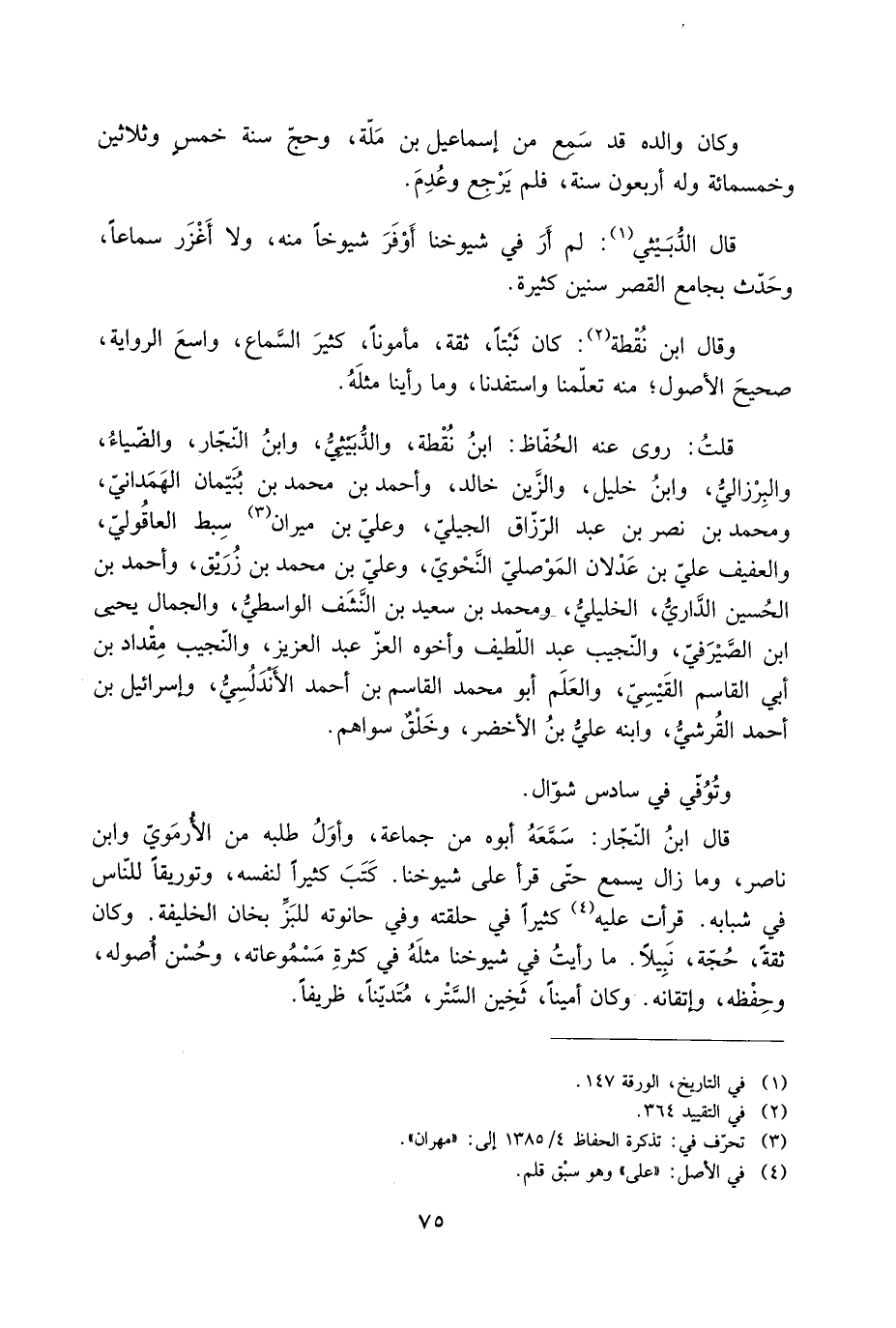 وَقَالَ ابن نُقْطة [2] : كَانَ ثَبْتًا، ثقة، مأمونا، كثير السَّماع، واسع الرواية، صحيح الْأصول، منه تعلّمنا واستفدنا، وما رأينا مثله.