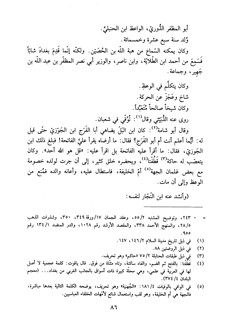 [5] في الوافي بالوفيات 4/ 181: «الجهنية» وهو تحريف، يوضحه الكلمة التالية بعدها مباشرة، فالجهة هي أم الخليفة، وهو لقب واستعمال شائع لأمّهات الخلفاء العباسيين.