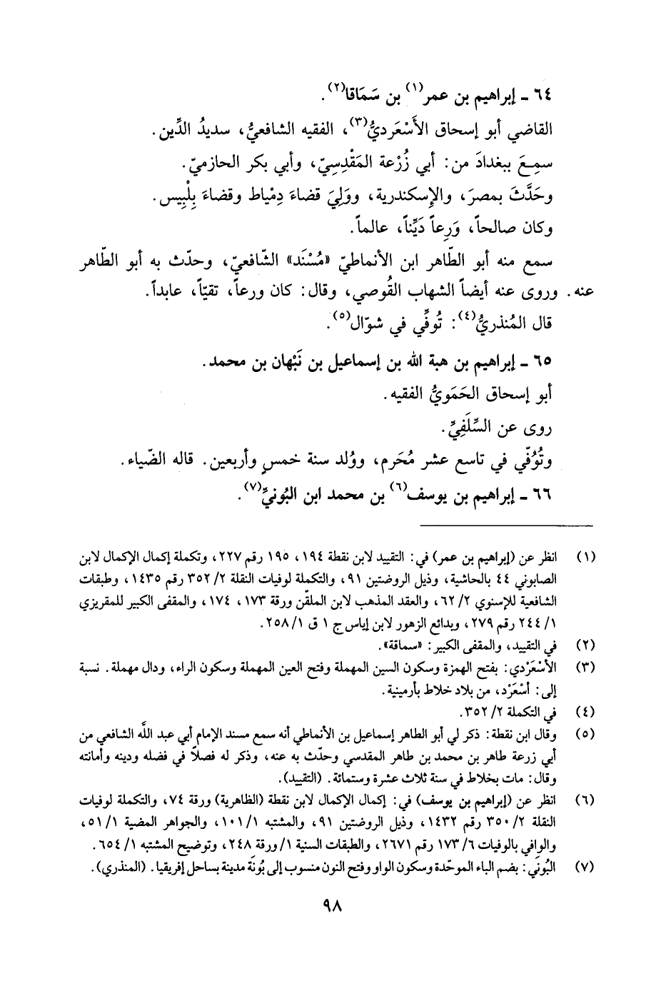 [1] انظر عن (إبراهيم بن عمر) في: التقييد لابن نقطة 194، 195 رقم 227، وتكملة إكمال الإكمال لابن الصابوني 44 بالحاشية، وذيل الروضتين 91، والتكملة لوفيات النقلة 2/ 352 رقم 1435، وطبقات الشافعية للإسنويّ 2/ 62، والعقد المذهب لابن الملقّن ورقة 173، 174، والمقفى الكبير للمقريزي 1/ 244 رقم 279، وبدائع الزهور لابن إياس ج 1 ق 1/ 258.