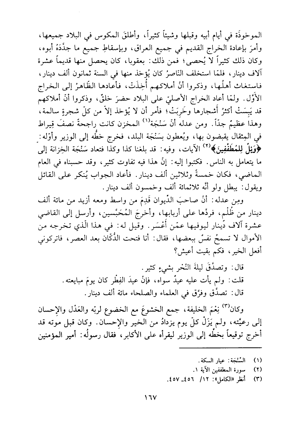 وَيْلٌ لِلْمُطَفِّفِينَ 83: 1 [2] الآيات، وفيه: قد بَلَغَنَا كذا وكذا فتعاد سَنْجَة الخِزانة إلى ما يتعامل به الناس. فكتبوا إليه: إنّ هذا فيه تفاوت كثير، وقد حسبناه في العام الماضي، فكان خمسة وثلاثين ألف دينار. فأعاد الجواب يُنكر على القائل ويقول: يبطل ولو أنّه ثلاثمائة ألف وخمسون ألف دينار.