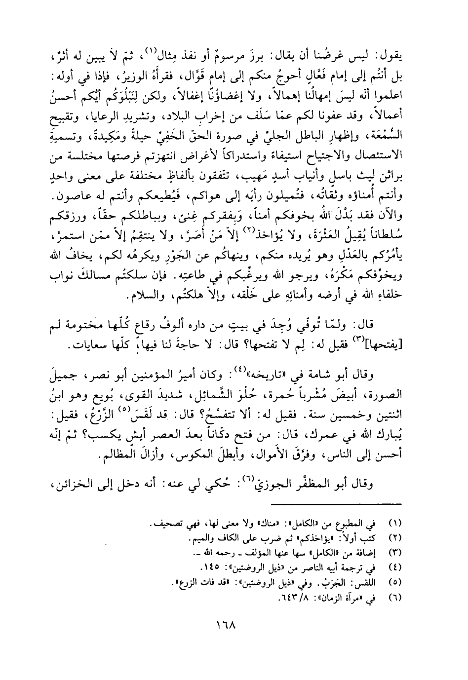 يقول: ليس غرضُنا أن يقال: برزَ مرسومٌ أو نفذ مِثال [1] ، ثمّ لا يبين لَهُ أثرٌ، بل أنتُم إلى إمام فَعَّالٍ أحوجُ منكم إلى إمام قَوَّال، فقرأَهُ الوزيرُ، فإذا في أوله: