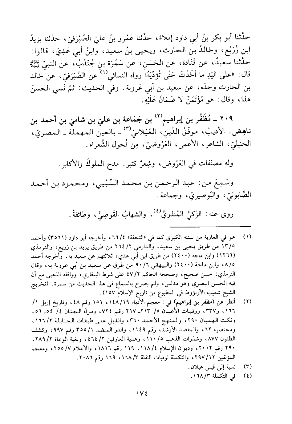 209- مُظَفَّر بن إبراهيم [2] بن جَمَاعة بن عليّ بن شاميّ بن أحمد بن ناهِض. الأديبُ، موفّقُ الدِّين، العَيْلَانيّ [3]- بالعين المهملة- المِصْريّ، الحَنْبَليّ، الشاعر، الأعمى، العَرُوضيّ، من فُحول الشُّعراء.