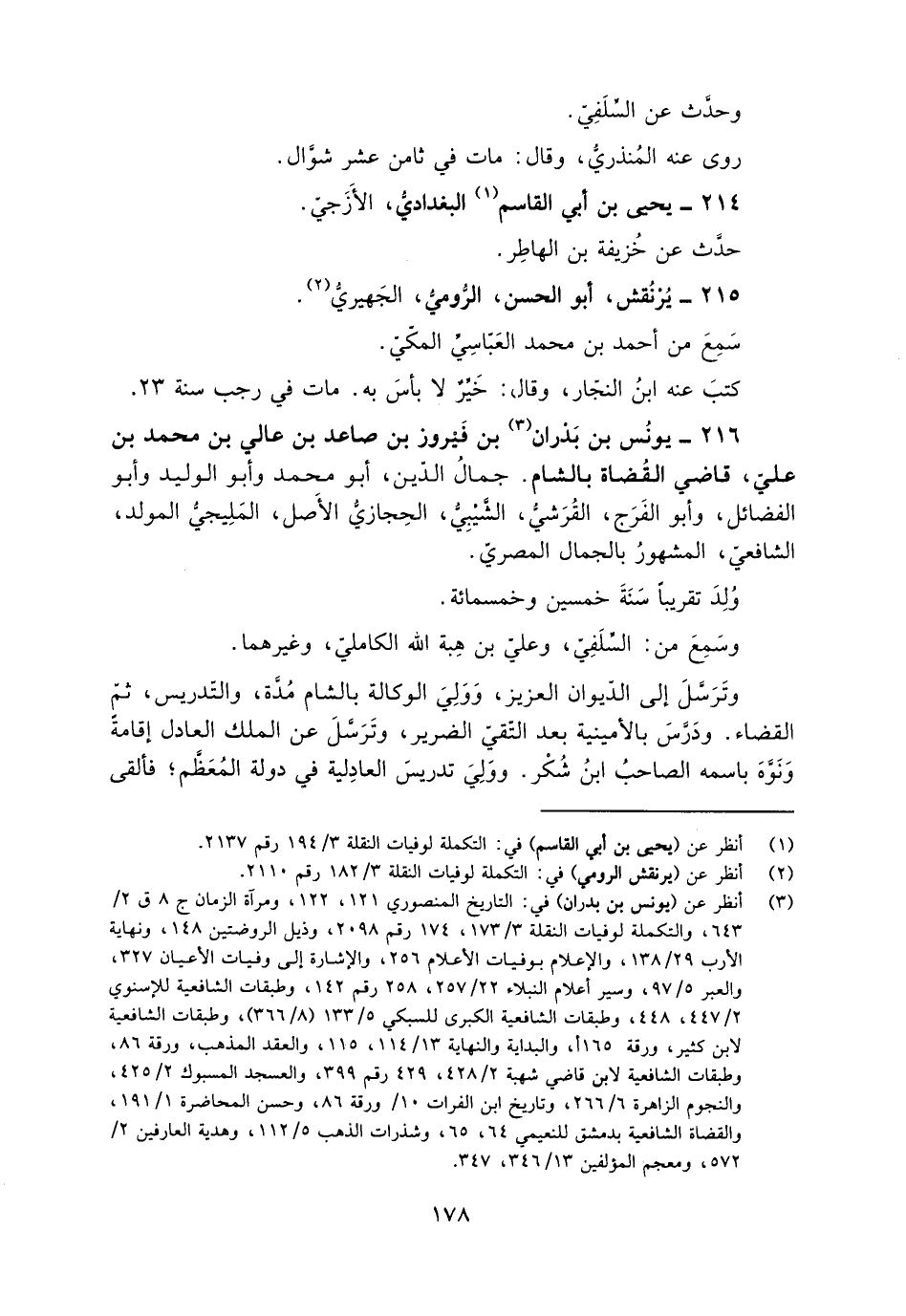 216- يونُس بن بَدْران [3] بن فَيْروز بن صاعد بن عالي بن مُحَمَّد بن عليّ، قاضي القُضاة بالشام. جمالُ الدِّين، أبو محمد وأبو الوليد وأبو الفضائل، وأبو الفَرَج، القُرَشيّ، الشَّيْبيّ، الحِجازيُّ الأَصل، المَلِيجيُّ المولد، الشافعيّ، المشهورُ بالجمال المِصْريّ.