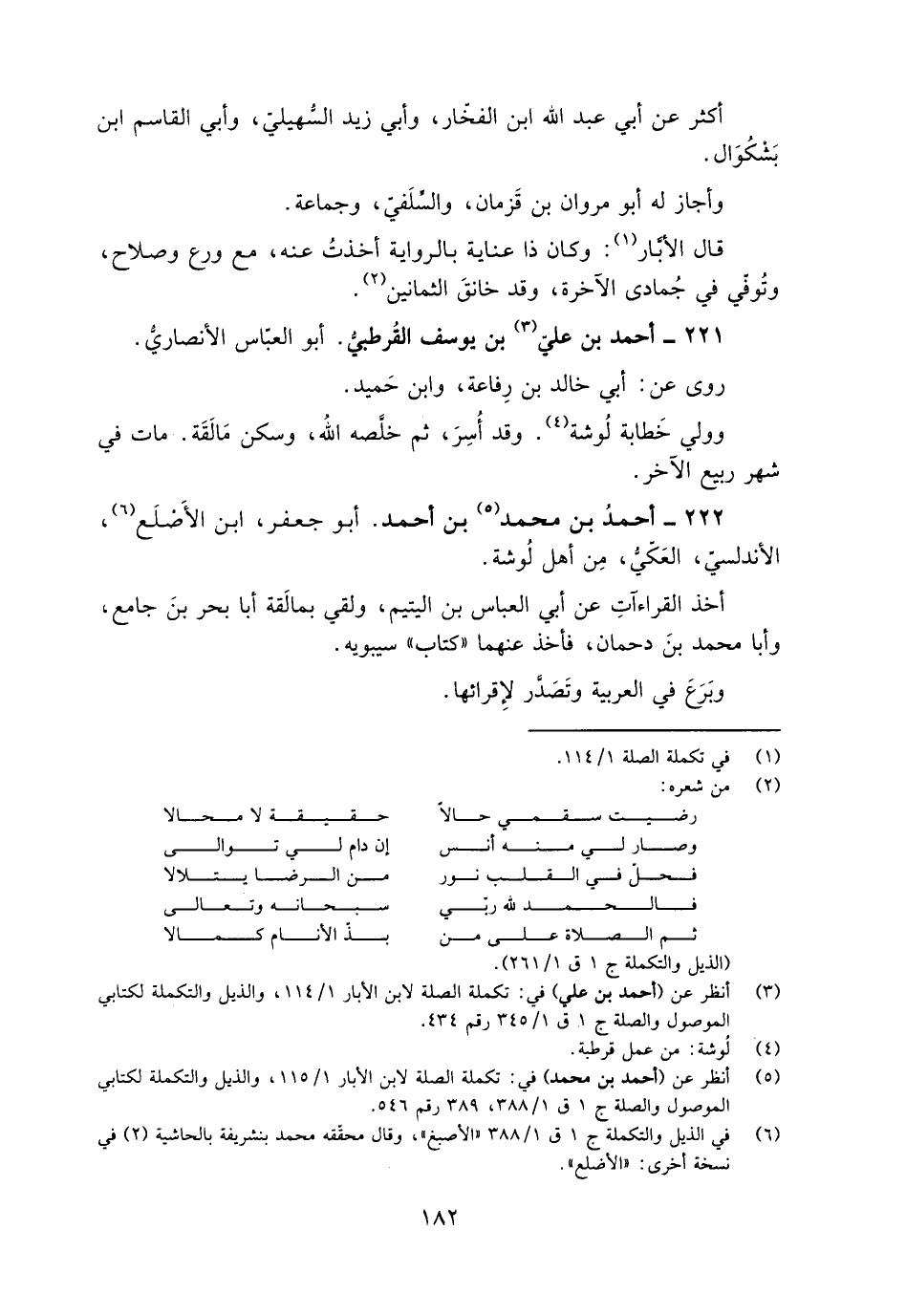 [5] انظر عن (أحمد بن محمد) في: تكملة الصلة لابن الأبار 1/ 115، والذيل والتكملة لكتابي الموصول والصلة ج 1 ق 1/ 388، 389 رقم 546.