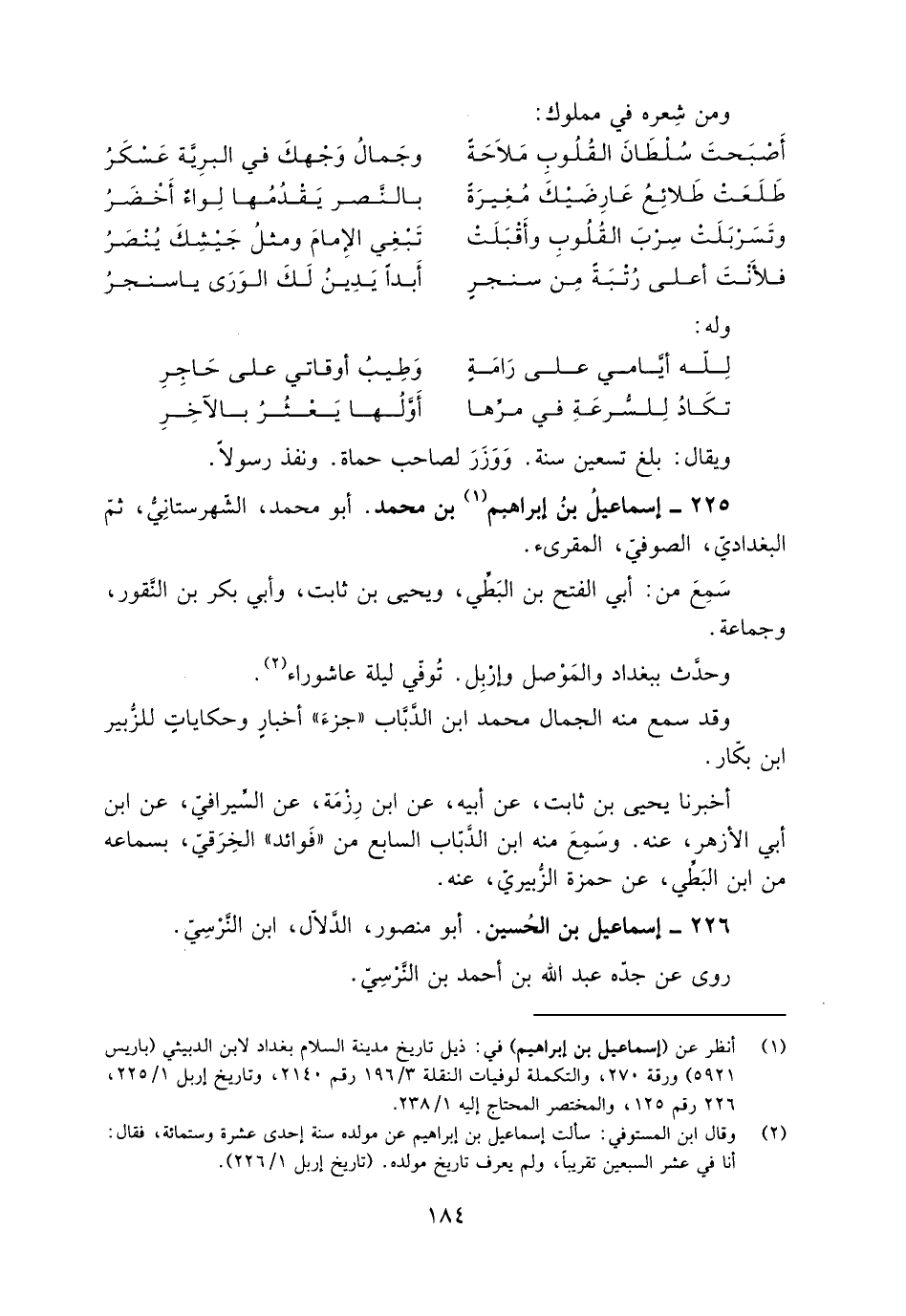 225- إسماعيل بن إبراهيم [1] بن مُحَمَّد. أبو مُحَمَّد، الشّهرستانِيُّ، ثمّ البَغْداديُّ، الصُّوفيّ، المقرئ.