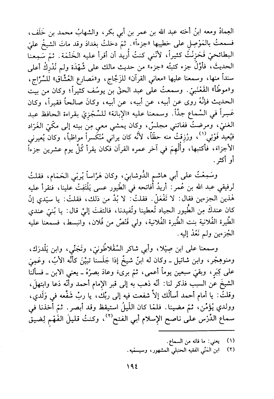 العمادُ ومعه ابن أخته عَبْد اللَّه بْن عُمَر بْن أَبِي بَكْر، والشهابُ مُحَمَّد بن خَلَف، فسمعتُ بالمَوْصِل على خطيبها «جزءا» . ثمّ دخلتُ بغدادَ وقد ماتَ الشيخُ عليّ البطائحيّ فَحَزِنْتُ كثيرا، لأنّني كنتُ أُريد أن أقرأ عليه الخَتْمَة. ثمّ سَمِعَنا الحديثَ، فأوَّل جزء كتبته «جزء» من حديث مالك على شُهْدَةَ ولم نُدْرِكْ أعلى سندا منها، وسمعنا عليها «معاني القرآن» للزجّاج، و «مصارع العشّاق» للسّرّاج، و «موطّأ» القَعْنَبيّ. وسمعت على عبد الحقّ بن يوسُف كثيرا، وكان من بيت الحديث فإنَّه رَوَى عَن أبيه، عن أبيه، عن أبيه، وكان صالحا فقيرا، وكان عَسِرًا فِي السَّماع جِدًّا. وسمعنا عليه «الإِبانة» للسِّجْزِيّ بقراءة الحافظ عبد الغنيّ، ومرضتُ ففاتني مجلسٌ، وكان يمشي معي مِن بيته إلى مكّيّ الغَرّاد فيُعيد فُوتِي [1] ، ورزُقت منه حظّا، لأَنَّه كَانَ يراني مُنْكَسرًا مُواظبًا، وكان يُعيرني الأجزاءَ، فأكتبها، وألهِمَ فِي آخر عِمره القرآن فكان يقرأ كُلَّ يوم عشرين جزءا أو أكثر.