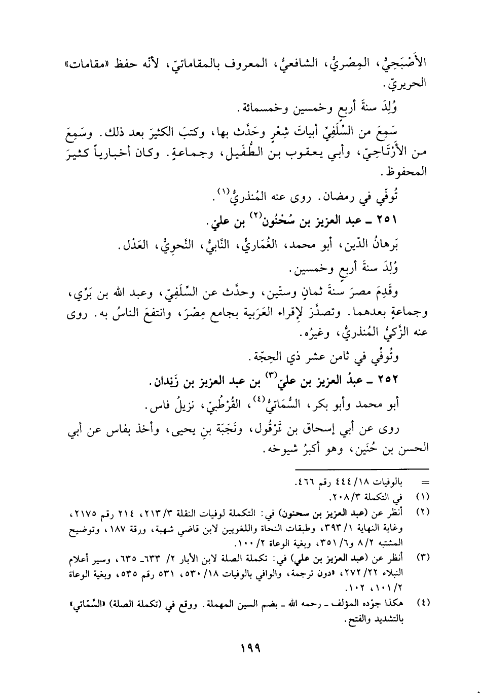 [2] انظر عن (عبد العزيز بن سحنون) في: التكملة لوفيات النقلة 3/ 213، 214 رقم 2175، وغاية النهاية 1/ 393، وطبقات النحاة واللغويين لابن قاضي شهبة، ورقة 187، وتوضيح المشتبه 2/ 8 و 6/ 351، وبغية الوعاة 2/ 100.