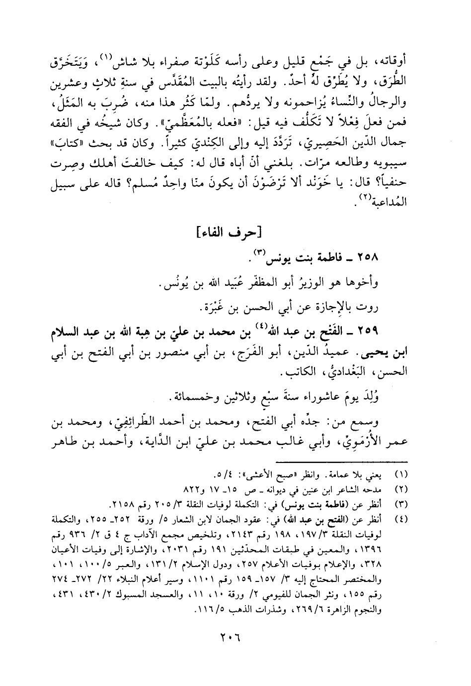 [4] انظر عن (الفتح بن عبد الله) في: عقود الجمان لابن الشعار 5/ ورقة 252- 255، والتكملة لوفيات النقلة 3/ 197، 198 رقم 2143، وتلخيص مجمع الآداب ج 4 ق 2/ 936 رقم 1396، والمعين في طبقات المحدّثين 191 رقم 2031، والإشارة إلى وفيات الأعيان 328، والإعلام بوفيات الأعلام 257، ودول الإسلام 2/ 131، والعبر 5/ 100، 101، والمختصر المحتاج إليه 3/ 157- 159 رقم 1101، وسير أعلام النبلاء 22/ 272- 274 رقم 155، ونثر الجمان للفيومي 2/ ورقة 10، 11، والعسجد المسبوك 2/ 430، 431، والنجوم الزاهرة 6/ 269، وشذرات الذهب 5/ 116.