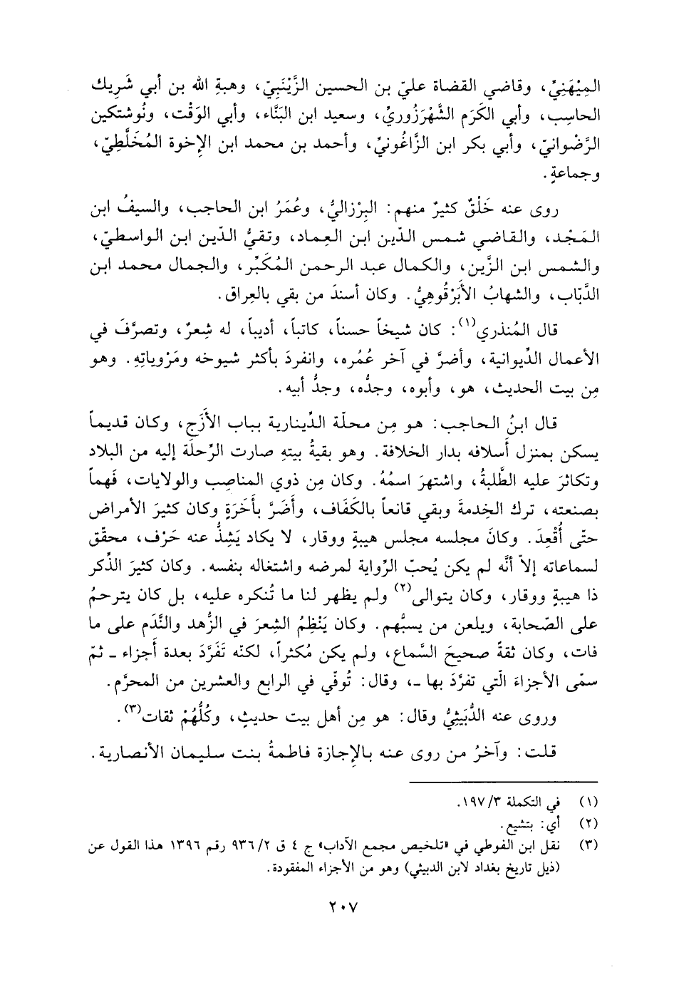 [3] نقل ابن الفوطي في «تلخيص مجمع الآداب» ج 4 ق 2/ 936 رقم 1396 هذا القول عن (ذيل تاريخ بغداد لابن الدبيثي) وهو من الأجزاء المفقودة.