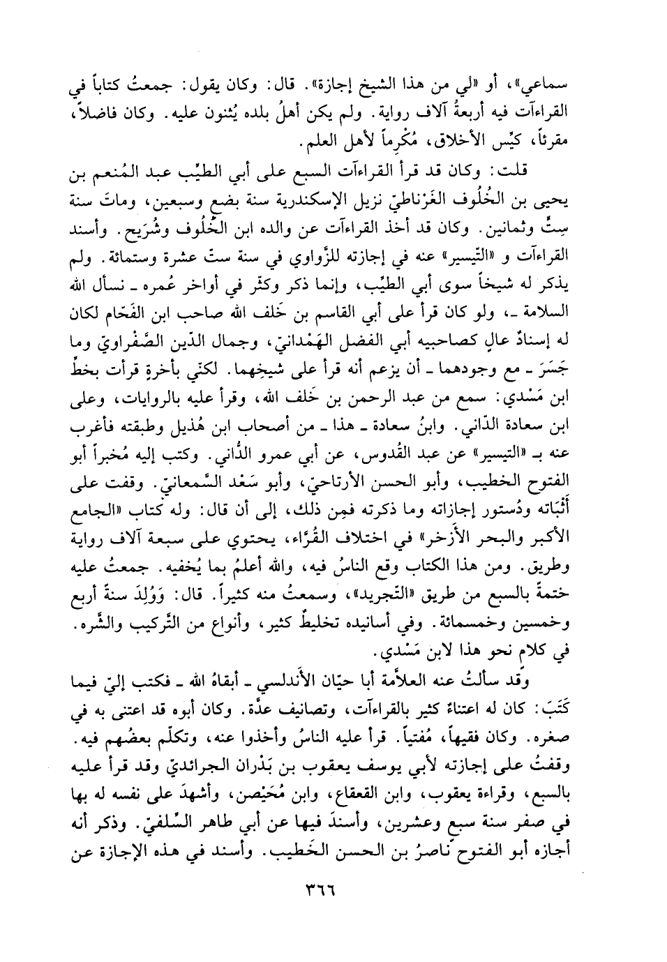 سماعي، أو «لي من هذا الشيخ إجازة» . قال: وكان يقول: جمعتُ كتابا في القراءات فيه أربعةُ آلاف رواية. ولم يكن أهلُ بلده يُثنون عليه. وكان فاضلا، مقرئا، كيِّس الأخلاق، مُكْرِمًا لأهل العِلْم.
