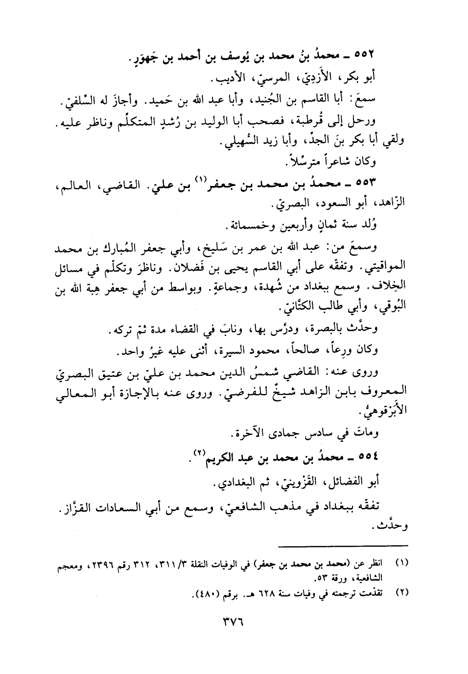 [1] انظر عن (محمد بن محمد بن جعفر) في الوفيات النقلة 3/ 311، 312 رقم 2396، ومعجم الشافعية، ورقة 53.