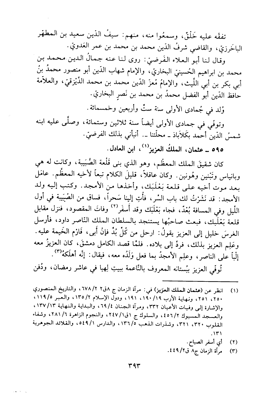 كَانَ شقيق الملك المعظّم، وهو الّذي بنى قلعة الصّبيبة، وكانت لَهُ هي وبانياس وتبنين وهونين. وكان عاقلا، قليل الكلام تبعا لأخيه المعظّم. عامل بعد موت أخيه على قلعة بَعْلَبَكّ، وأخذها من الأمجد. وكتب إليه وُلِدَ الأمجد: قد نشرت لك باب السّر، فأت إلينا سحرا، فساق من الصبيبة في أول اللّيل وفي المسافة بعد، فجاء بَعْلَبَكّ وقد أسفر [2] وفات المقصود، فنزل مقابل قلعة بَعْلَبَكّ، فبعث صاحبها يستنجد بالسلطان الملك النّاصر داود، فأرسل الغرس خليل إلى العزيز يقول: أرحل من كلّ بدّ فإن أبى، فارم الخيمة عليه.