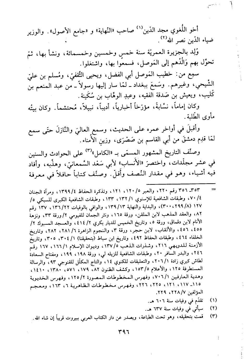وصنّف التاريخ المشهور المسمّى ب- «الكامل» [3] على الحوادث والسنين في عشر مجلّدات، واختصر «الأنساب» لأبي سعد السّمعانيّ، وهذّبه، وأفاد فيه أشياء، وهو في مقدار النّصف وأقلّ. وصنّف كتابا حافلا في معرفة