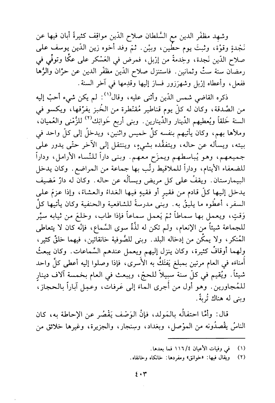 ذكره القاضي شمس الدِّين وأثنى عليه، وقال [1] : لم يكن شيء أحبّ إليه من الصَّدقة، وكان لَهُ كلّ يوم قناطير مُقنْطرة من الخُبز يفرِّقها، ويكسو في السنة خَلقًا ويُعطيهم الدِّينار والدِّينارين. وبنى أربع خَوانِك [2] للزُّمنى والعُميان، وملأها بهم، وكان يأتيهم بنفسه كلَّ خميس واثنين، ويدخلُ إلى كلّ واحد في بيته، ويسأله عن حاله، ويتفقّده بشيءٍ، وينتقل إلى الآخر حَتّى يدور على جميعهم، وهُوَ يُباسطهم ويمزَح معهم. وبنى دارا للنِّساء الأرامل، ودارا للضعفاء الأيتام، ودارا للملاقيط رتَّب بها جماعة من المراضع. وكان يدخل البيمارستان. ويقفُ على كل مريض ويسألُه عن حاله. وكان لَهُ دارٌ مَضيف يدخل إليها كلّ قادم من فقيرٍ أو فقيهٍ فيها الغداءُ والعشاءُ، وإذا عزمَ على السفر، أعطوه ما يليقُ به. وبنى مدرسة للشافعية والحنفية وكان يأتيها كلَّ وَقتٍ، ويعمل بها سماطا ثمّ يَعمل سماعا فإذا طاب، وخلعَ من ثيابه سيَّر للجماعة شيئا من الإنعام، ولم تكن لَهُ لذَّةً سوى السَّماع، فإنَّه كَانَ لا يتعاطى المُنكر، ولا يمكِّن من إدخاله البلد. وبنى للصّوفية خانقاتين، فيهما خلقٌ كثير، ولهما أوقافٌ كثيرة، وكان ينزل إليهم ويعمل عندهم السَّماعات. وكان يبعثُ أُمناءَه في العام مرتين بمبلغ يَفْتَكُّ به الأَسرى، فإذا وصلوا إليه أعطى كلَّ واحد شيئا. ويُقيم في كلَّ سَنَة سبيلا للحجّ، ويبعث في العام بخمسة آلاف دينارٍ للمُجاورين. وهُوَ أول من أجرى الماءَ إلى عَرفات، وعمِل آبارا بالحجاز، وبنى لَهُ هناك تُربةً.