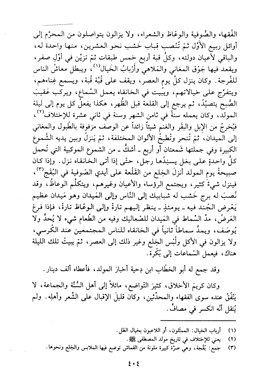 الفُقهاء والصُّوفية والوعّاظ والشعراء، ولا يزالون يتواصلون من المحرَّم إلى أوائل ربيع الأوّل ثمّ تُنْصب قِباب خَشب نحو العشرين، منها واحدة لَهُ، والباقي لأعيان دولته، وكلُّ قبة أربع خمسٍ طبقات ثمّ تزيَّن في أوّلِ صفر، ويقعد فيها جَوْق المغاني والمَلاهي وأَرْبابُ الخَيال [1] ، ويبطل معاشُ النَّاس للفُرجة. وكان ينزل كلَّ يومٍ العصر، ويقف على قُبَّة قُبة، ويسمع غِناءهم، ويتفرَّج على خيالاتهم، ويبيت في الخانقاه يعمل السَّماع، ويركب عَقيب الصُّبح يتصيَّدُ، ثم يرجع إلى القلعة قبل الظُّهر، هكذا يفعلُ كل يوم إلى ليلة المولد، وكان يعمله سنة في ثامنٍ الشهر وسَنةَ في ثاني عشرة للاختلاف [2] ، فيُخرجُ من الإِبل والبقَر والغنم شيئا زائدا عن الوصف مزفوفة بالطّبول والمغاني إلى الميدان، ثمّ تُنحر وتُطبخُ الألوان المختلفة، ثمّ ينزل وبين يديه الشّموع الكبيرة وفي جملتها شمعتان أو أربع- أشكّ- من الشموع الموكبية التي تحمل كلُّ واحدةٍ على بغل يسنِدُها رجل، حَتّى إذا أتى الخانقاه نزل. وإذا كَانَ صبيحةُ يومِ المولد أنزلَ الخِلع من القَلْعة على أيدي الصُّوفية في البُقَج [3] ، فينزل شيءٌ كثير، ويجتمع الرؤساء والأعيان وغيرهم، ويَتَكَلَّم الوعاظُ، وقد نُصبَ لَهُ برج خَشب لَهُ شبابيك إلى النَّاس وإلى المَيدان وهُوَ مَيدان عظيم يَعْرض الْجُند فيه- يومئذٍ- ينظر إليهم تارةٍ وإلى الوعّاظ تارة، فإذا فرغ العَرضُ، مدَّ السِّماط في المَيدان للصّعاليك وفيه من الطّعام شيء لا يُحدُ ولا يُوصَف ويمدُّ سماطا ثانيا في الخانقاه للناس المجتمعين عند الكُرسي، ولا يزالون في الأكل ولُبْس الخِلع وغير ذلك إلى العصر، ثمّ يبيتُ تلك الليلة هناك، فيعمل السّماعات إلى بُكْرة.