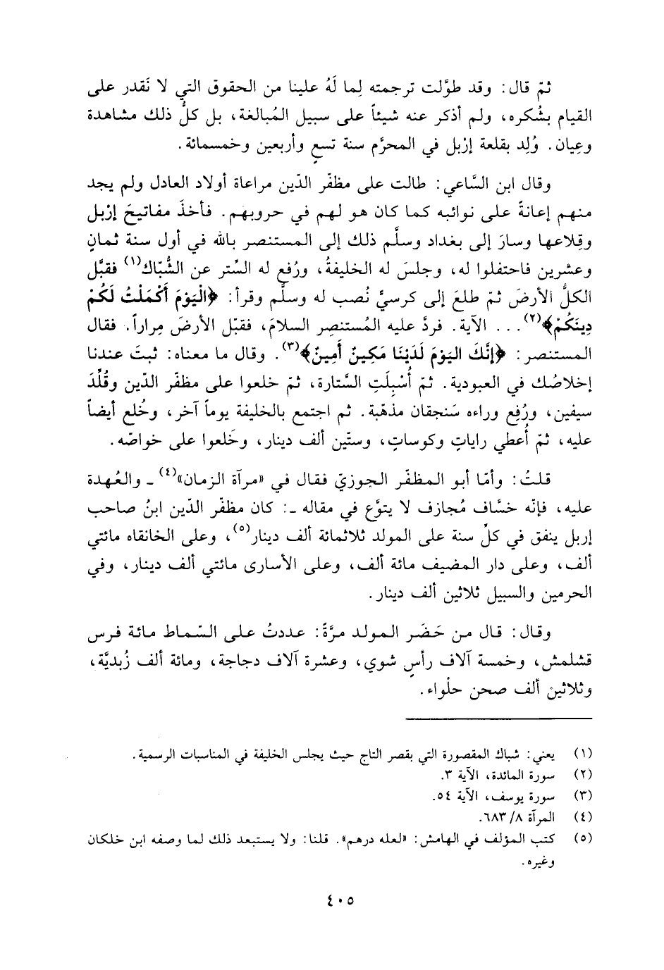 قلتُ: وأمّا أبو المظفّر الجوزيّ فقال في «مرآة الزمان» [4]- والعُهدة عليه، فإنَّه خسَّاف مُجازف لا يتوَّع في مقاله-: كَانَ مظفّر الدِّين ابن صاحب إربل ينفق في كلّ سنة على المولد ثلاثمائة ألف دينار [5] ، وعلى الخانقاه مائتي ألف، وعلى دار المضيف مائة ألف، وعلى الأسارى مائتي ألف دينار، وفي الحرمين والسبيل ثلاثين ألف دينار.