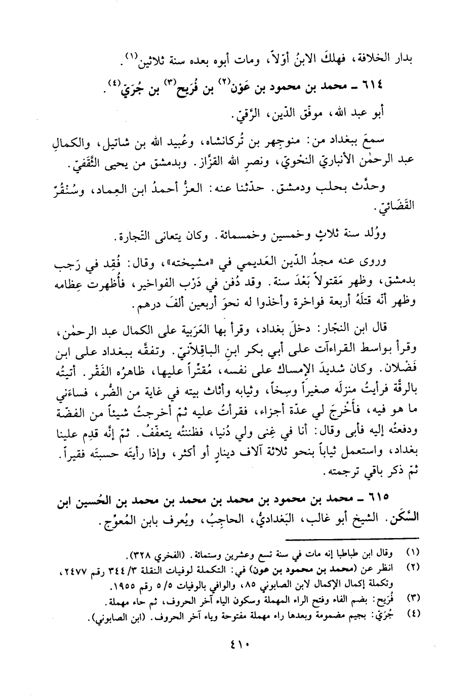 [2] انظر عن (محمد بن محمود بن عون) في: التكملة لوفيات النقلة 3/ 344 رقم 2477، وتكملة إكمال الإكمال لابن الصابوني 85، والوافي بالوفيات 5/ 5 رقم 1955.