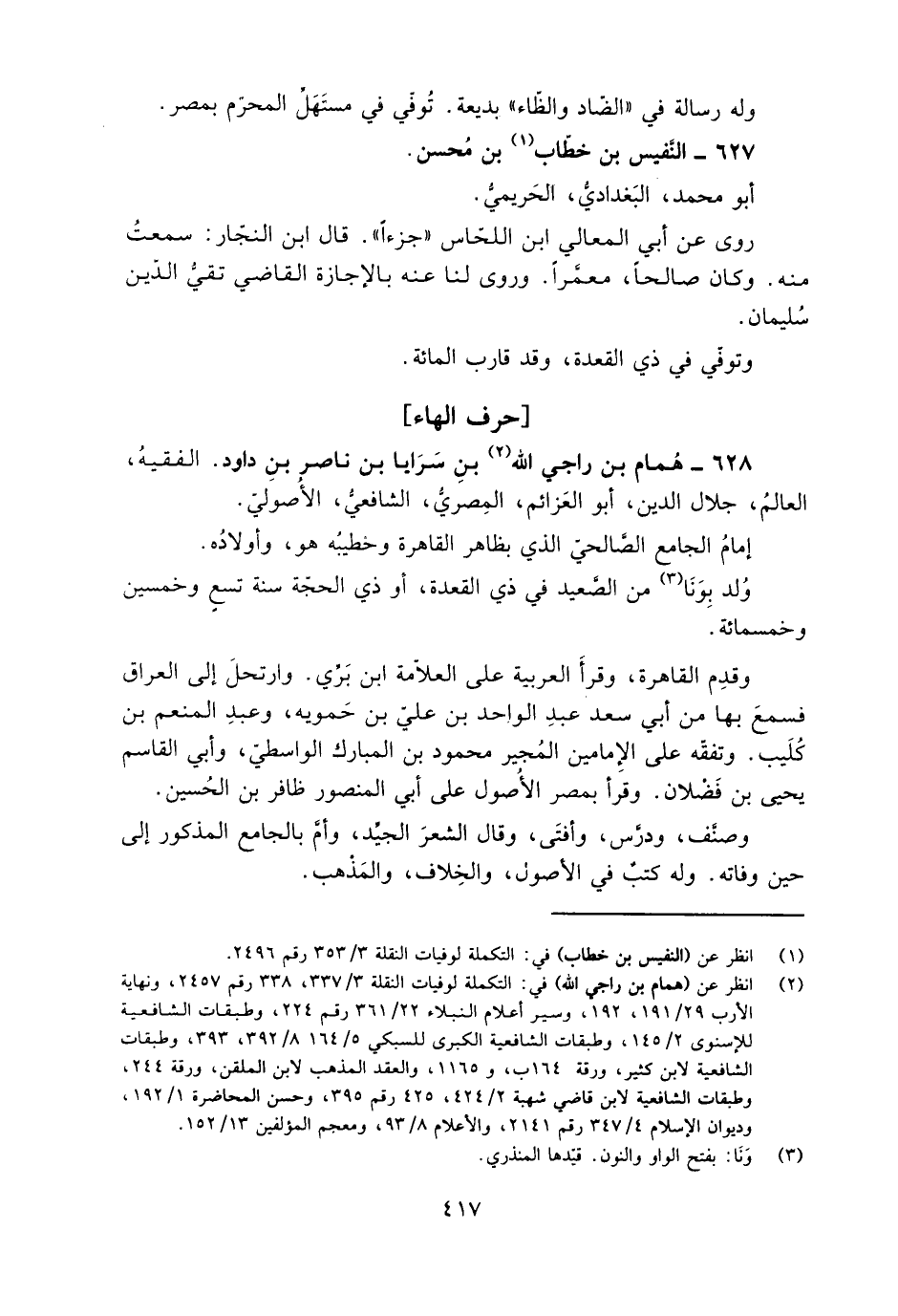 [2] انظر عن (همام بن راجي الله) في: التكملة لوفيات النقلة 3/ 337، 338 رقم 2457، ونهاية الأرب 29/ 191، 192، وسير أعلام النبلاء 22/ 361 رقم 224، وطبقات الشافعية للإسنويّ 2/ 145، وطبقات الشافعية الكبرى للسبكي 5/ 164 8/ 392، 393، وطبقات الشافعية لابن كثير، ورقة 164 ب، و 1165، والعقد المذهب لابن الملقن، ورقة 244، وطبقات الشافعية لابن قاضي شهبة 2/ 424، 425 رقم 395، وحسن المحاضرة 1/ 192، وديوان الإسلام 4/ 347 رقم 2141، والأعلام 8/ 93، ومعجم المؤلفين 13/ 152.