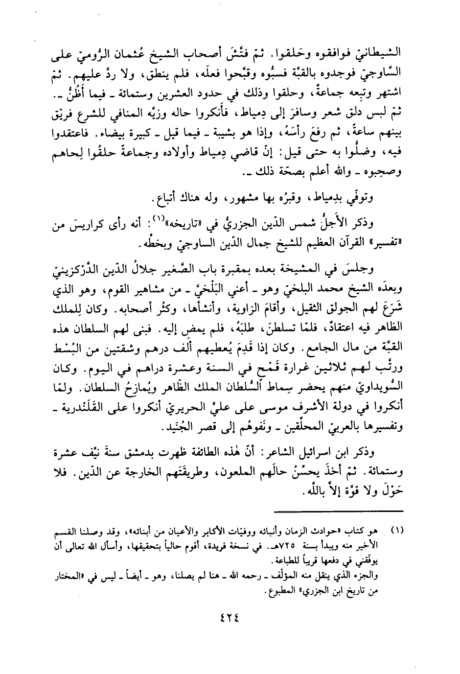الشيطانيّ فوافقوه وحلقوا. ثمّ فتّش أصحاب الشيخ عثمان الرُّوميّ على السّاوجيّ فوجدوه بالقبّة فسبّوه وقبّحوا فعله، فلم ينطق، ولا ردّ عليهم. ثمّ اشتهر وتبعه جماعةٌ، وحلقوا وذلك في حدود العشرين وستمائة- فيما أظنّ-.