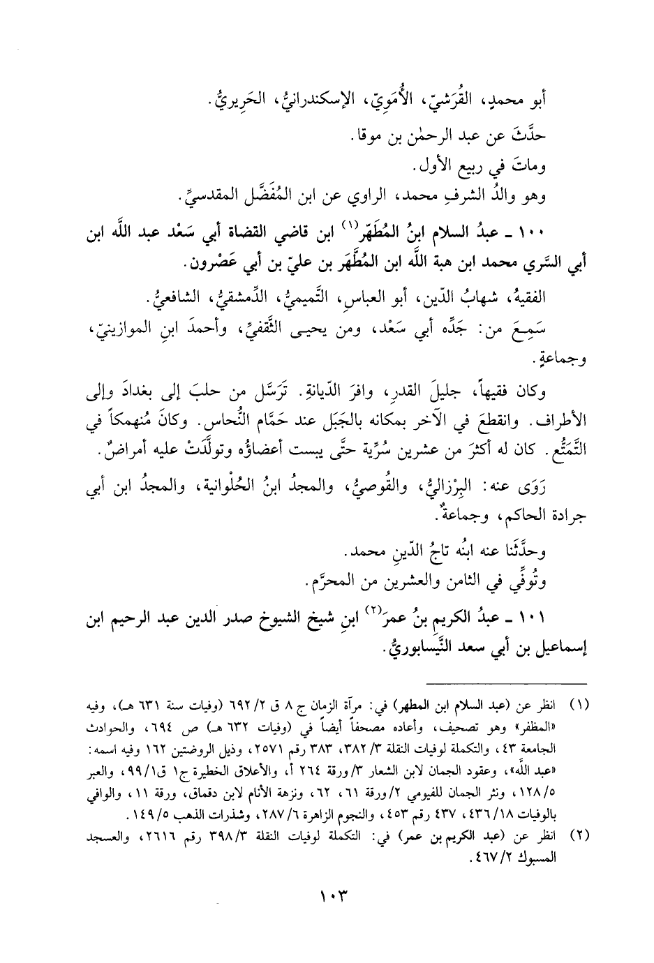 100- عبدُ السلام ابنُ المُطَهّر [1] ابن قاضي القضاة أَبِي سَعْد عَبْد الله بن أبي السّري محمد ابن هبة الله ابن المُطَّهَر بْن عَلِيّ بْن أَبِي عَصْرون.