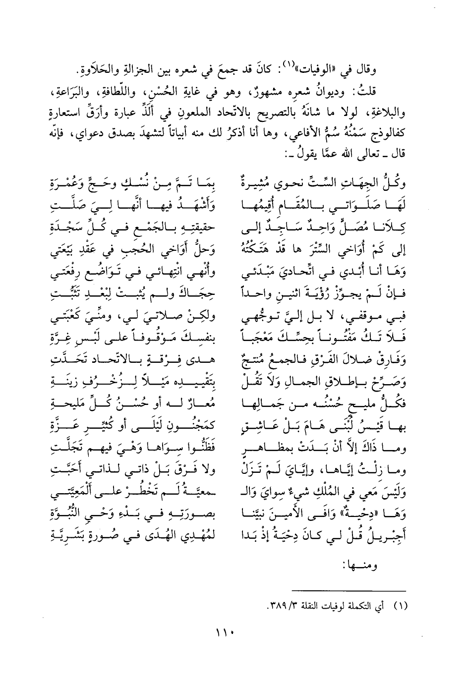 قلتُ: وديوانُ شعرِه مشهورٌ، وهو فِي غاية الْحَسَن، واللّطافَة، والبَرَاعةِ، والبلاغةِ، لولا ما شانَهُ بالتصريح بالاتّحاد الملعونِ فِي ألذِّ عبارة وأرَقِّ استعارةٍ كفالوذج سَمْنُهُ سُمُّ الأفاعي، وها أَنَا أذكرُ لك منه أبياتا لتشهدَ بصدق دعواي، فإنّه قَالَ- تعالى اللَّه عمّا يَقُولُ-: