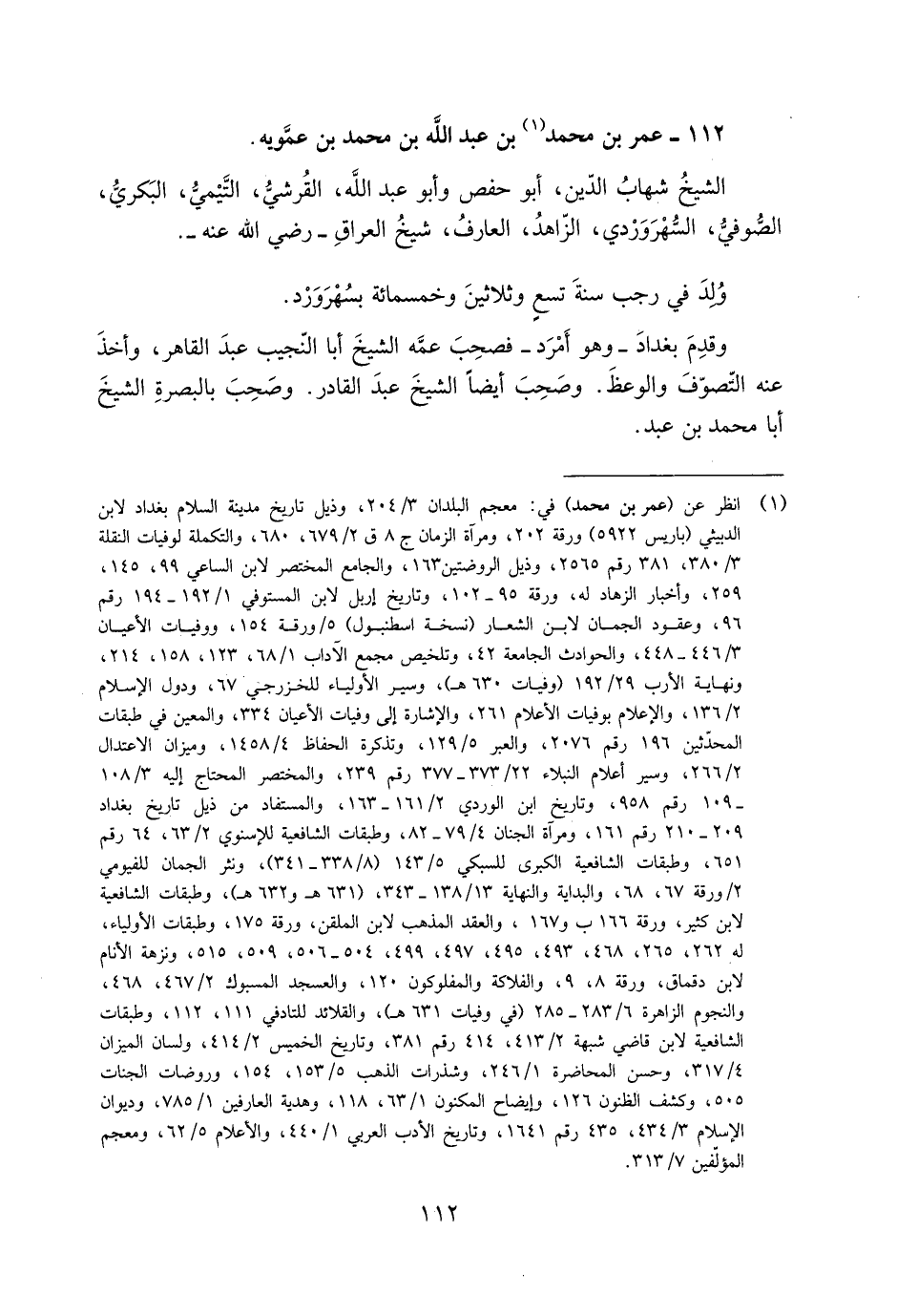 [1] انظر عن (عمر بن محمد) في: معجم البلدان 3/ 204، وذيل تاريخ مدينة السلام بغداد لابن الدبيثي (باريس 5922) ورقة 202، ومرآة الزمان ج 8 ق 2/ 679، 680، والتكملة لوفيات النقلة 3/ 380، 381 رقم 2565، وذيل الروضتين 163، والجامع المختصر لابن الساعي 99، 145، 259، وأخبار الزهاد له، ورقة 95- 102، وتاريخ إربل لابن المستوفي 1/ 192- 194 رقم 96، وعقود الجمان لابن الشعار (نسخة إسطنبول) 5/ ورقة 154، ووفيات الأعيان 3/ 446- 448، والحوادث الجامعة 42، وتلخيص مجمع الآداب 1/ 68، 123، 158، 214، ونهاية الأرب 29/ 192 (وفيات 630 هـ) ، وسير الأولياء للخزرجي 67، ودول الإسلام 2/ 136، والإعلام بوفيات الأعلام 261، والإشارة إلى وفيات الأعيان 334، والمعين في طبقات المحدّثين 196 رقم 2076، والعبر 5/ 129، وتذكرة الحفاظ 4/ 1458، وميزان الاعتدال 2/ 266، وسير أعلام النبلاء 22/ 373- 377 رقم 239، والمختصر المحتاج إليه 3/ 108- 109 رقم 958، وتاريخ ابن الوردي 2/ 161- 163، والمستفاد من ذيل تاريخ بغداد 209- 210 رقم 161، ومرآة الجنان 4/ 79- 82، وطبقات الشافعية للإسنويّ 2/ 63، 64 رقم 651، وطبقات الشافعية الكبرى للسبكي 5/ 143 (8/ 338- 341) ، ونثر الجمان للفيومي 2/ ورقة 67، 68، والبداية والنهاية 13/ 138- 343، (631 هـ و 632 هـ) ، وطبقات الشافعية لابن كثير، ورقة 166 ب و 167، والعقد المذهب لابن الملقن، ورقة 175، وطبقات الأولياء، له 262، 265، 468، 493، 495، 497، 499، 504- 506، 509، 515، ونزهة الأنام لابن دقماق، ورقة 8، 9، والفلاكة والمفلوكون 120، والعسجد المسبوك 2/ 467، 468، والنجوم الزاهرة 6/ 283- 285 (في وفيات 631 هـ) ، والقلائد للتادفي 111، 112، وطبقات الشافعية لابن قاضي شبهة 2/ 413، 414 رقم 381، وتاريخ الخميس 2/ 414، ولسان الميزان 4/ 317، وحسن المحاضرة 1/ 246، وشذرات الذهب 5/ 153، 154، وروضات الجنات 505، وكشف الظنون 126، وإيضاح المكنون 1/ 63، 118، وهدية العارفين 1/ 785، وديوان الإسلام 3/ 434، 435 رقم 1641، وتاريخ الأدب العربيّ 1/ 440، والأعلام 5/ 62، ومعجم المؤلّفين 7/ 313.
