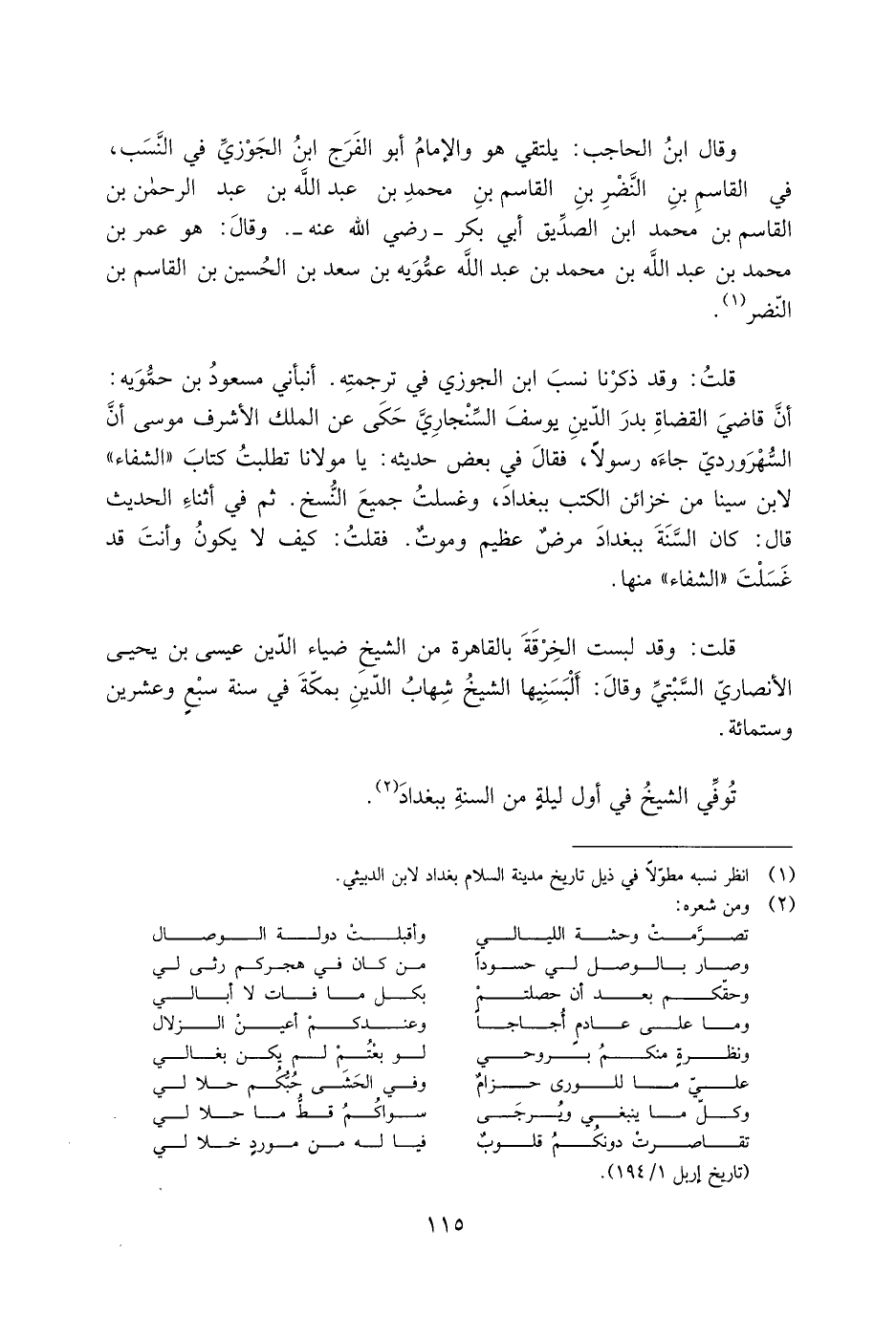 [1] انظر نسبه مطوّلا في ذيل تاريخ مدينة السلام بغداد لابن الدبيثي.