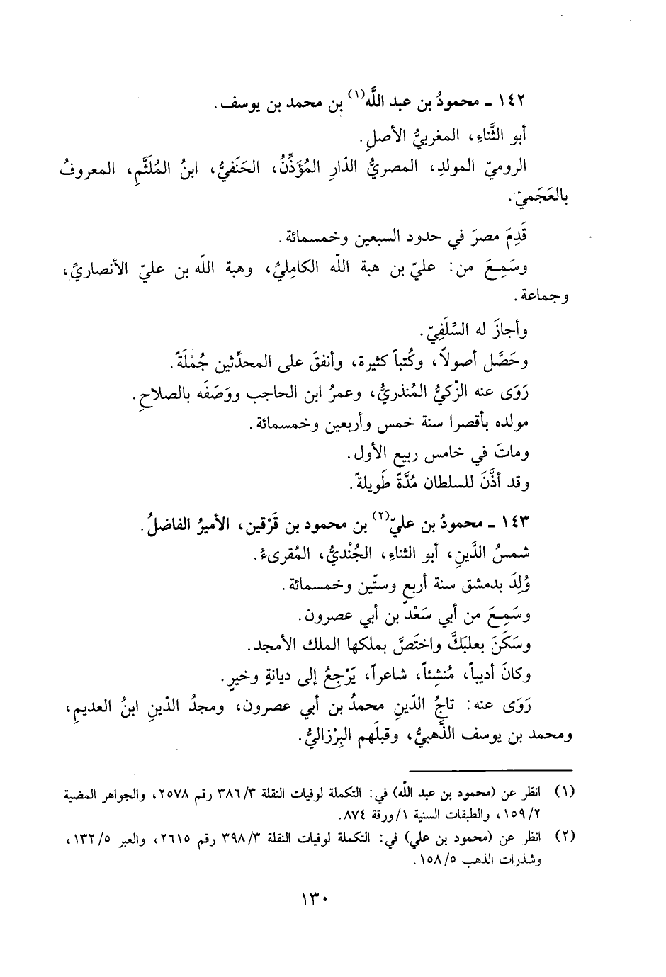 [2] انظر عن (محمود بن علي) في: التكملة لوفيات النقلة 3/ 398 رقم 2615، والعبر 5/ 132، وشذرات الذهب 5/ 158.