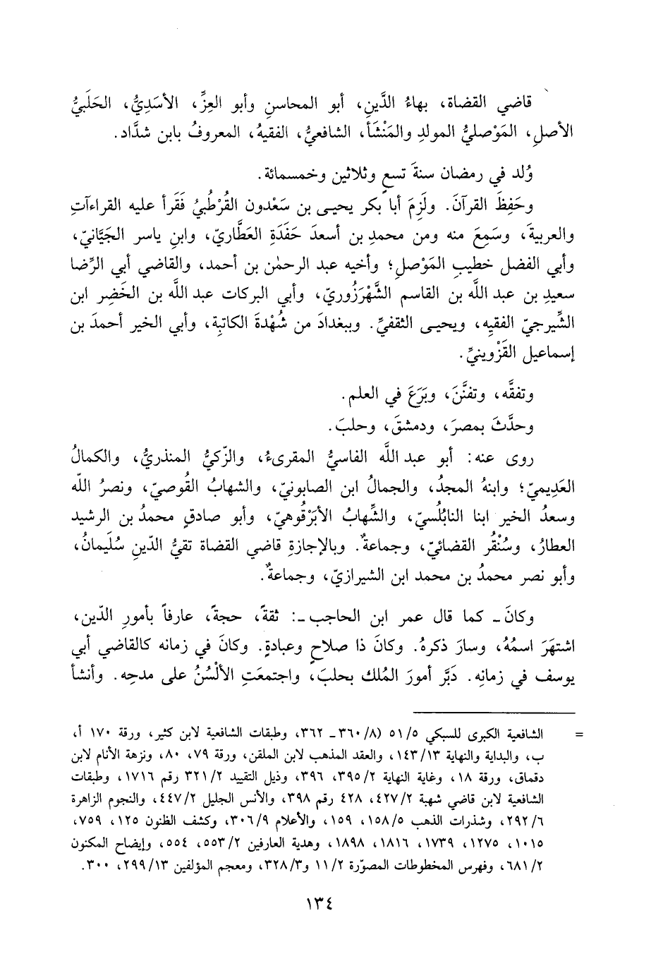 قاضي القضاة، بهاءُ الدّين، أَبُو المحاسِن وأَبُو العِزِّ، الأَسَدِيّ، الحلبيُّ الأصلِ، المَوْصِليّ المولدِ والمَنْشَأ، الشافعيّ، الفقيهُ، المعروف بابن شدّاد.