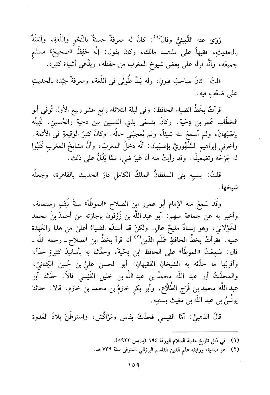 وقد سمع منه الإمام أبو عمرو ابن الصلاح «الموطّأ» سنة نيّف وستمائة، وأخبر به عن جماعة منهم: أَبُو عبد اللَّه بْن زَرْقون بإجازته من أَحْمَد بْن مُحَمَّد الخَوْلانيّ، وهو إسنادٌ مليحٌ عالٍ. ولكنْ قد أسندَه الضياءُ أعلى من هذا والعُهدة عَلَيْهِ. فقرأتُ بخطِّ الحافظِ عَلَم الدّين [2] أَنَّهُ قرأ بخطِّ ابْن الصلاح- رحمه اللَّه- قالَ: سمعتُ «الموطأ» عَلَى الحافظ ابن دحية، وحدّثنا به بأسانيد كثيرة جدّا، وأقربُها ما حدّثه بِهِ الشيخانِ الفقيهانِ: أَبُو الْحَسَن عَلِيّ بْن حُنين الكِنانيّ، والمحدّث أَبُو عَبْد اللَّه مُحَمَّد بْن عَبْد اللَّه بْن خليل القَيْسيّ قالَا: حَدَّثَنَا أَبُو عَبْد اللَّه مُحَمَّد بْن فَرَج الطَّلَّاع، وأَبُو بكرٍ خازمُ بْن مُحَمَّد بْن خازم، قالا: حَدَّثَنَا يونُسُ بْن عَبْد اللَّه بْن مغيث بسنده.