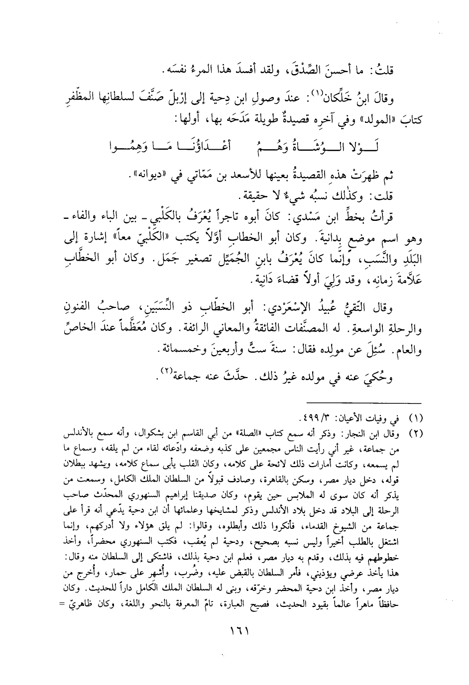 [2] وقال ابن النجار: وذكر أنه سمع كتاب «الصلة» من أبي القاسم ابن بشكوال، وأنه سمع بالأندلس من جماعة، غير أني رأيت الناس مجمعين على كذبه وضعفه وادّعائه لقاء من لم يلقه، وسماع ما لم يسمعه، وكانت أمارات ذلك لائحة على كلامه، وكان القلب يأبى سماع كلامه، ويشهد ببطلان قوله، دخل ديار مصر، وسكن بالقاهرة، وصادف قبولا من السلطان الملك الكامل، وسمعت من يذكر أنه كان سوى له الملابس حين يقوم، وكان صديقنا إبراهيم السنهوري المحدّث صاحب الرحلة إلى البلاد قد دخل بلاد الأندلس وذكر لمشايخها وعلمائها أن ابن دحية يدّعي أنه قرأ على جماعة من الشيوخ القدماء، فأنكروا ذلك وأبطلوه، وقالوا: لم يلق هؤلاء ولا أدركهم، وإنما اشتغل بالطلب أخيرا وليس نسبه بصحيح، ودحية لم يعقب، فكتب السنهوري محضرا، وأخذ خطوطهم فيه بذلك، وقدم به ديار مصر، فعلم ابن دحية بذلك، فاشتكى إلى السلطان منه وقال: