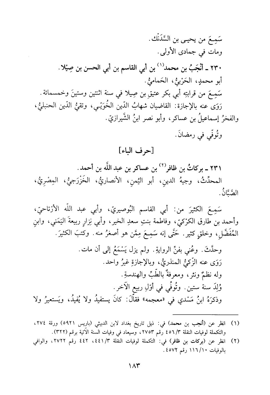 [1] انظر عن (أنجب بن محمد) في: ذيل تاريخ بغداد لابن الدبيثي (باريس 5921) ورقة 274، والتكملة لوفيات النقلة 3/ 456 رقم 2753، وسيعاد في وفيات السنة الآتية برقم (322) .