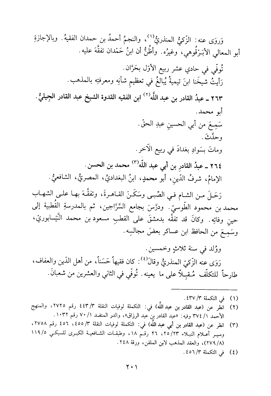 [3] انظر عن (عبد القادر بن أبي عبد الله) في: التكملة لوفيات النقلة 3/ 455، 456 رقم 2758، وسير أعلام النبلاء 23/ 25، 26 رقم 18، وطبقات الشافعية الكبرى للسبكي 5/ 119 (8/ 279) ، والعقد المذهب لابن الملقن، ورقة 248.