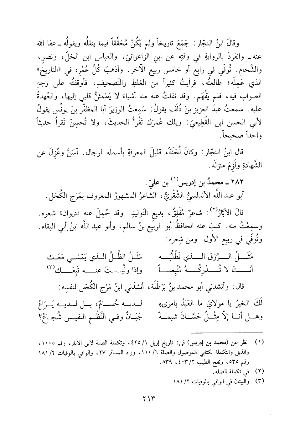 [1] انظر عن (محمد بن إدريس) في: تاريخ إربل 1/ 425، وتكملة الصلة لابن الأبار، رقم 1005، والذيل والتكملة لكتابي الموصول والصلة 6/ 110، وزاد المسافر 27، والوافي بالوفيات 2/ 181 رقم 535، ونفح الطيب 2/ 403، 539.