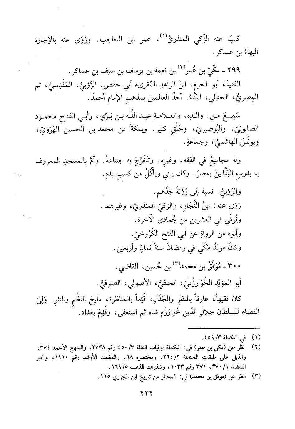 [2] انظر عن (مكي بن عمر) في: التكملة لوفيات النقلة 3/ 450 رقم 2738، والمنهج الأحمد 374، والذيل على طبقات الحنابلة 2/ 264، ومختصره 68، والمقصد الأرشد رقم 1160، والدر المنضد 1/ 370، 371 رقم 1033، وشذرات الذهب 5/ 169.