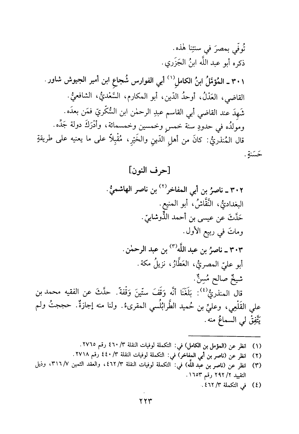 [2] انظر عن (ناصر بن أبي المفاخر) في: التكملة لوفيات النقلة 3/ 440 رقم 2718.