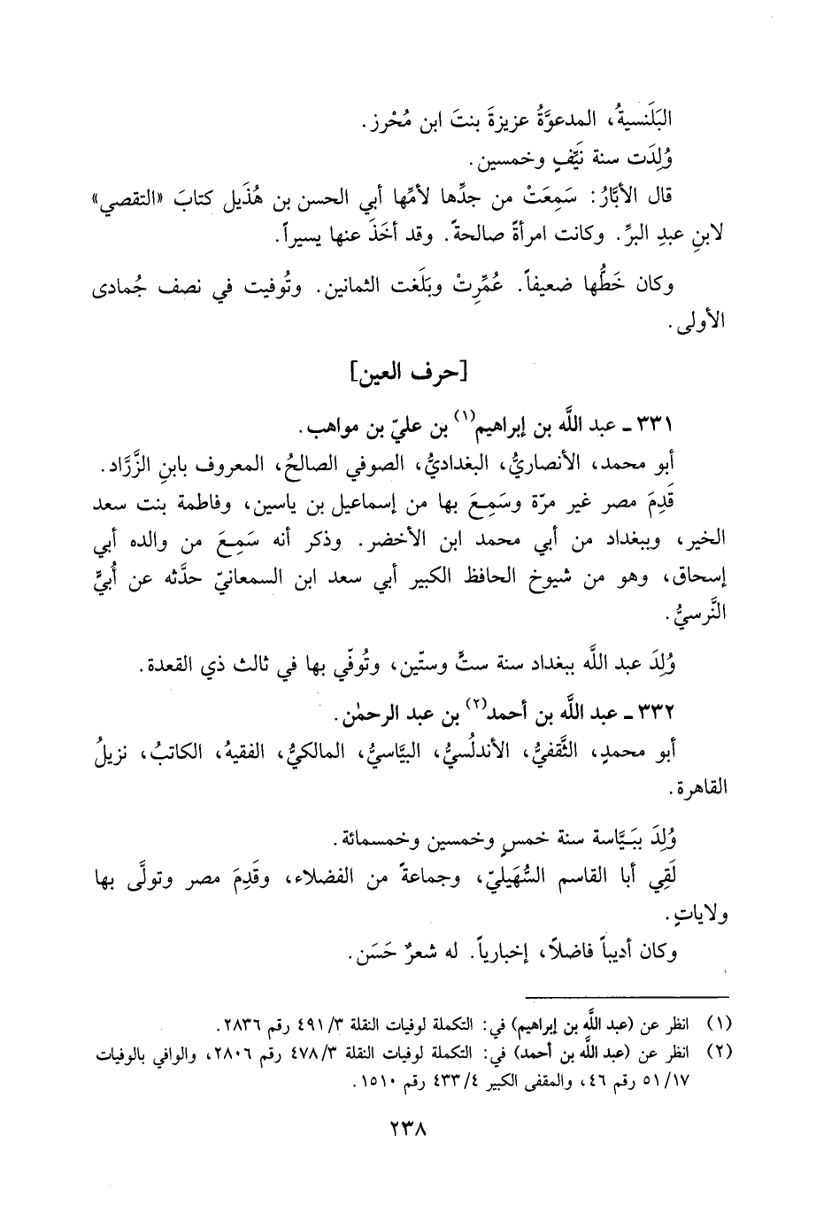 [2] انظر عن (عبد الله بن أحمد) في: التكملة لوفيات النقلة 3/ 478 رقم 2806، والوافي بالوفيات 17/ 51 رقم 46، والمقفى الكبير 4/ 433 رقم 1510.