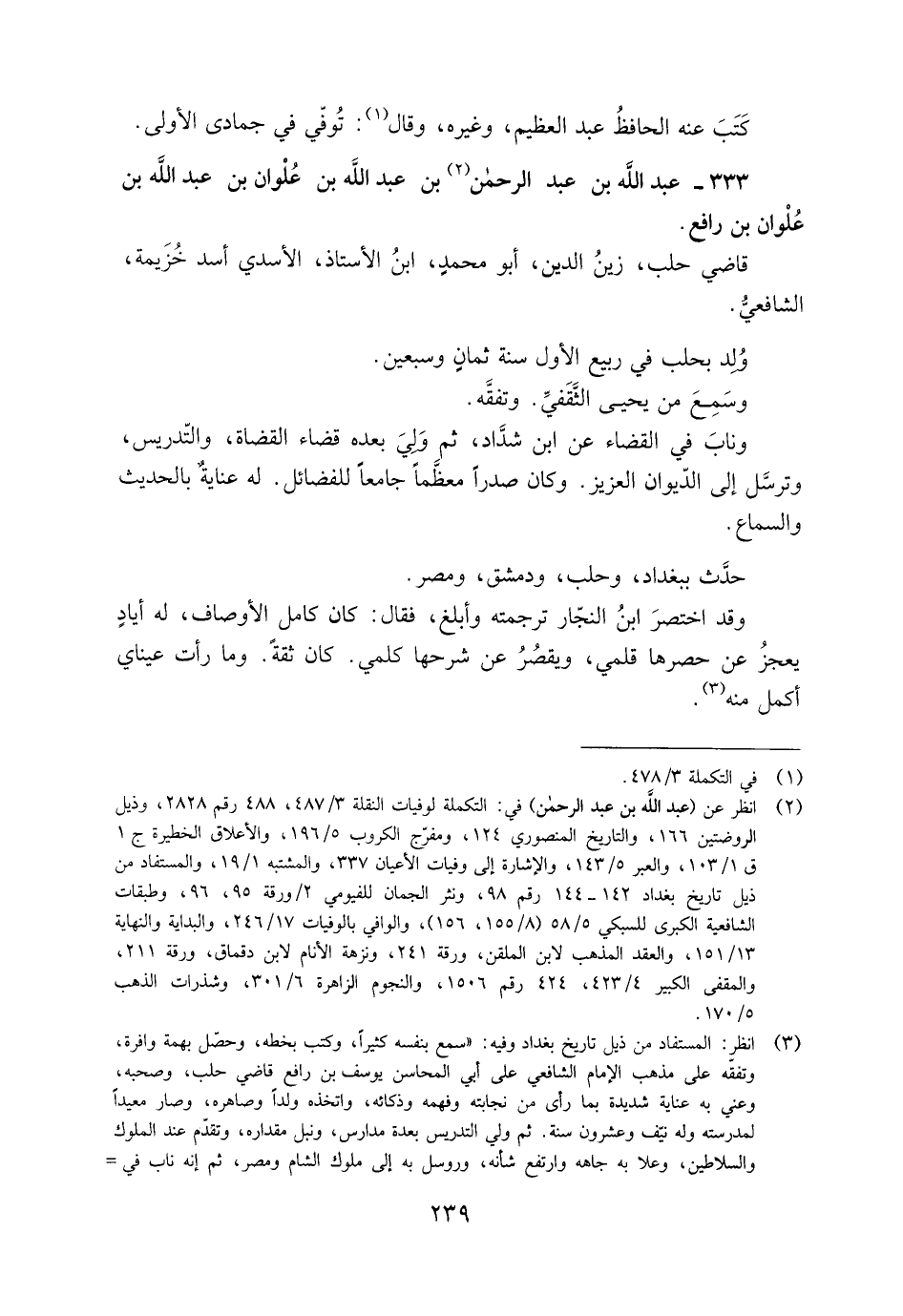 [3] انظر: المستفاد من ذيل تاريخ بغداد وفيه: «سمع بنفسه كثيرا، وكتب بخطه، وحصّل بهمة وافرة، وتفقّه على مذهب الإمام الشافعيّ على أبي المحاسن يوسف بن رافع قاضي حلب، وصحبه، وعني به عناية شديدة بما رأى من نجابته وفهمه وذكائه، واتخذه ولدا وصاهره، وصار معيدا لمدرسته وله نيّف وعشرون سنة. ثم ولي التدريس بعدة مدارس، ونبل مقداره، وتقدّم عند الملوك والسلاطين، وعلا به جاهه وارتفع شأنه، وروسل به إلى ملوك الشام ومصر، ثم إنه ناب في