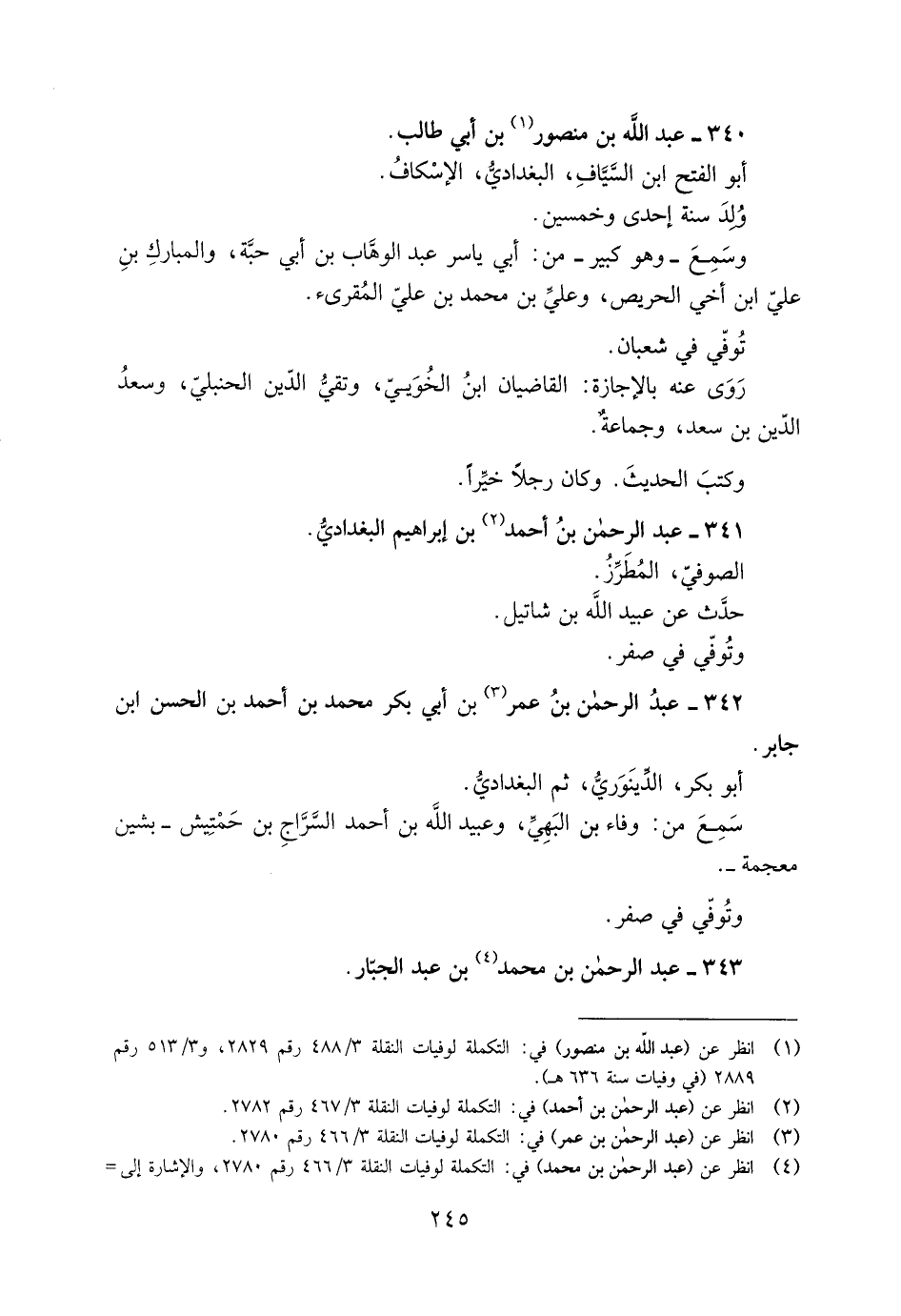 [1] انظر عن (عبد الله بن منصور) في: التكملة لوفيات النقلة 3/ 488 رقم 2829، و 3/ 513 رقم 2889 (في وفيات سنة 636 هـ) .