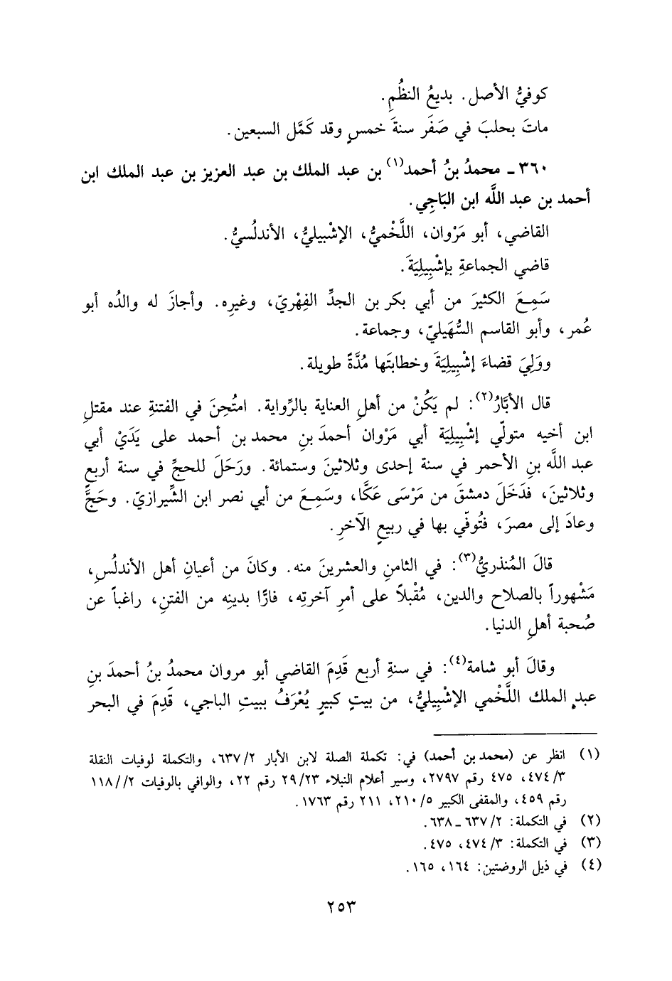 وقال أبو شامة [4] : فِي سنة أربع قَدِمَ القاضي أَبُو مروان مُحَمَّد بْن أحمد بن عبد الملك اللّخمي الإشبيليُّ، من بيتٍ كبيرٍ يُعْرَفُ ببيتِ الباجي، قدم في البحر